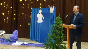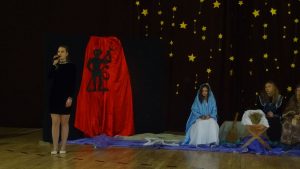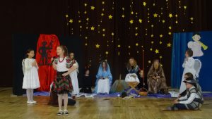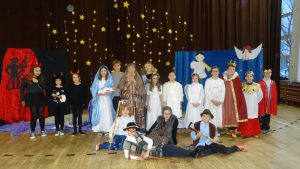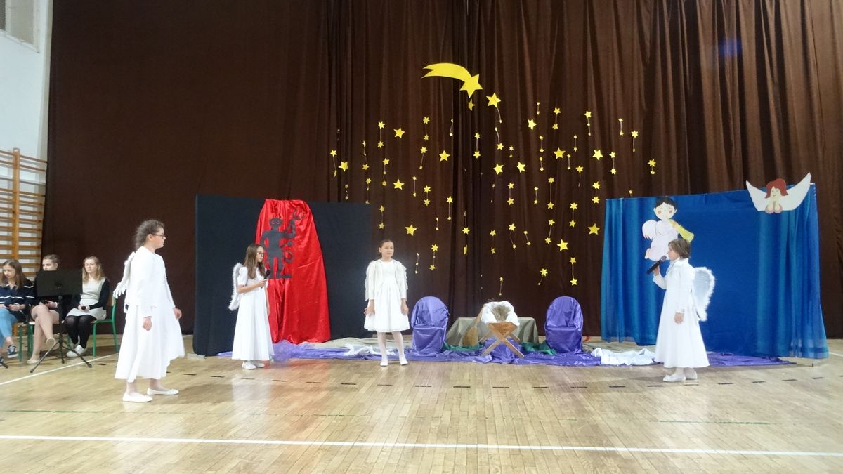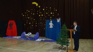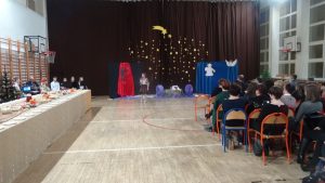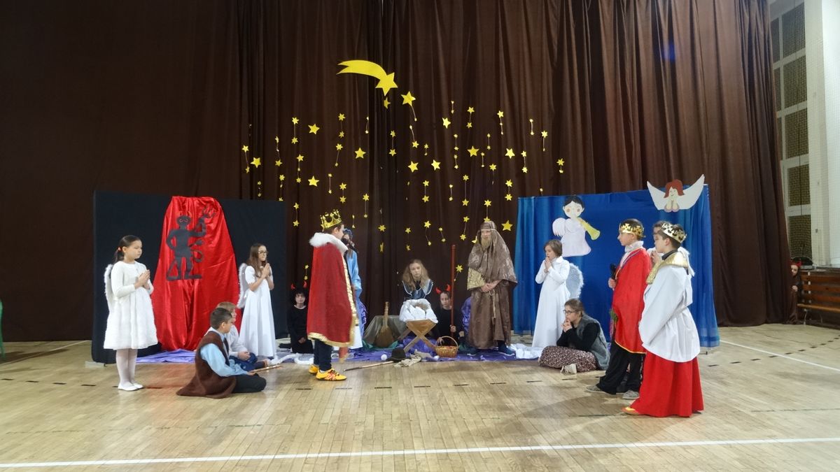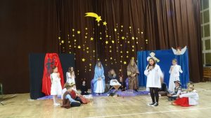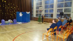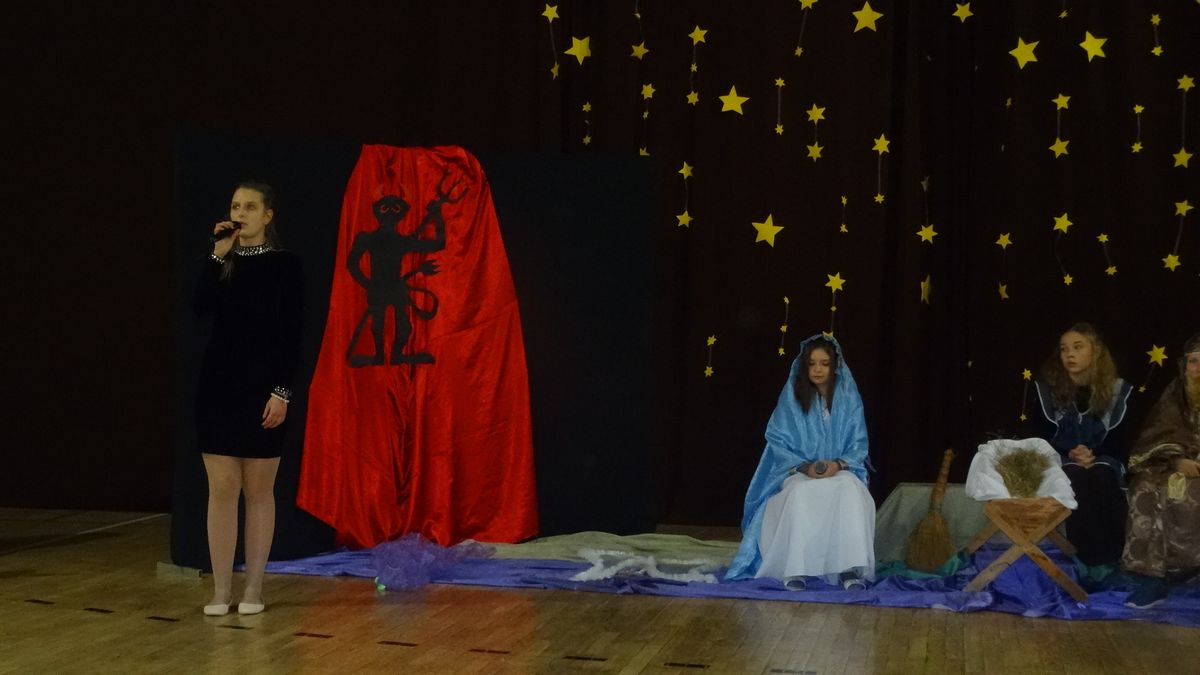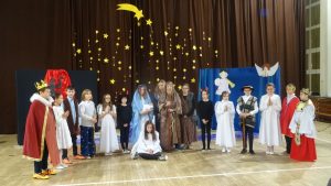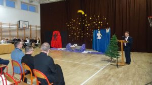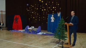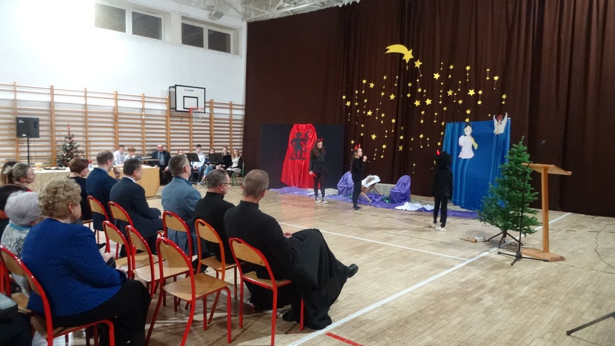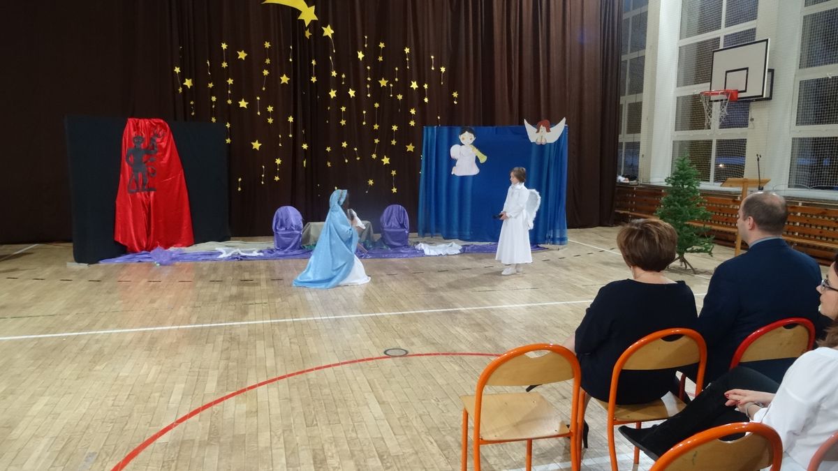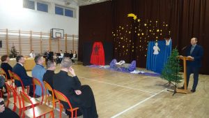 Pan dyrektor Leszek Goliszek powitał zgromadzonych gości i współpracowników. W krótkim przemówieniu dokonał podsumowania minionego roku oraz złożył życzenia noworoczne. Następnie życzenia złożył pan Sławomir Plis. Spotkanie uświetniły jasełka w wykonaniu uczniów klasy V, którzy przybliżyli nam tradycję Świąt Bożego Narodzenia, walkę dobra ze złem: diabłów i wspaniałych aniołów, które wskazywały drogę do stajenki. Przepiękne kolędy i pastorałki wykonał chórek uczniowski. Gromkie brawa były najlepszym dowodem uznania dla wykonawców oraz ich katechetki – pani Beaty Adamczyk.