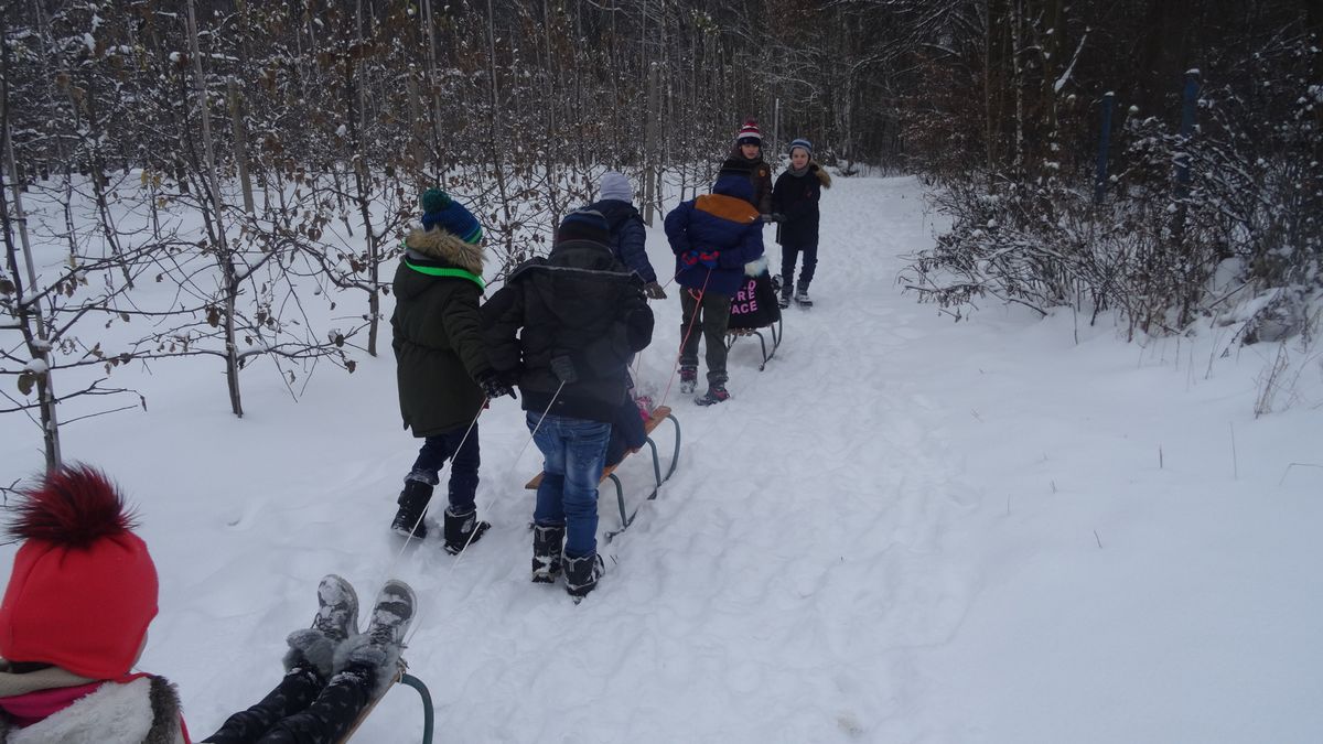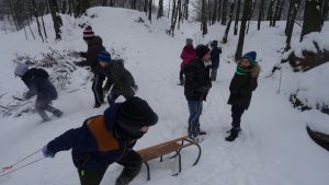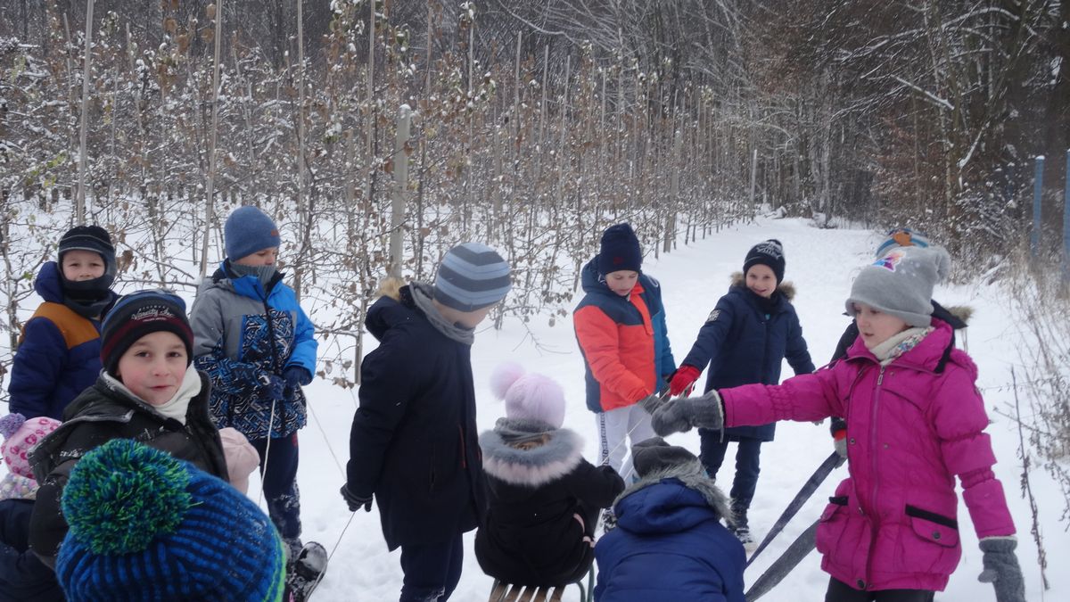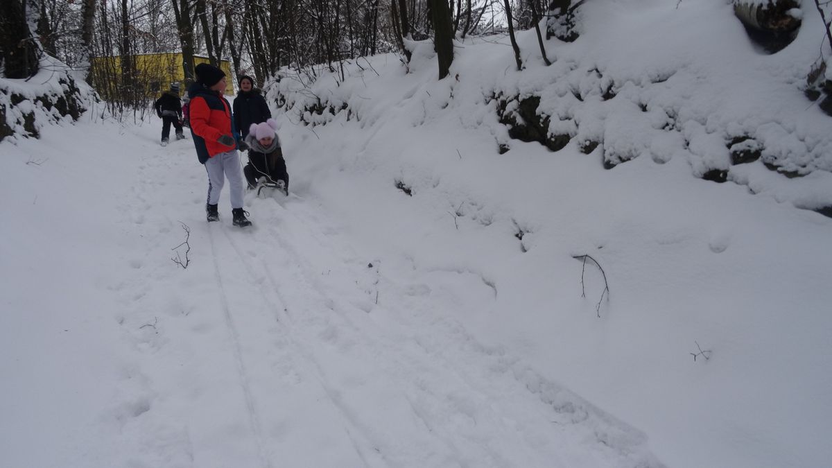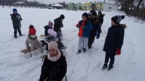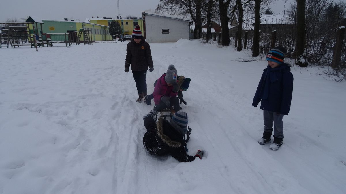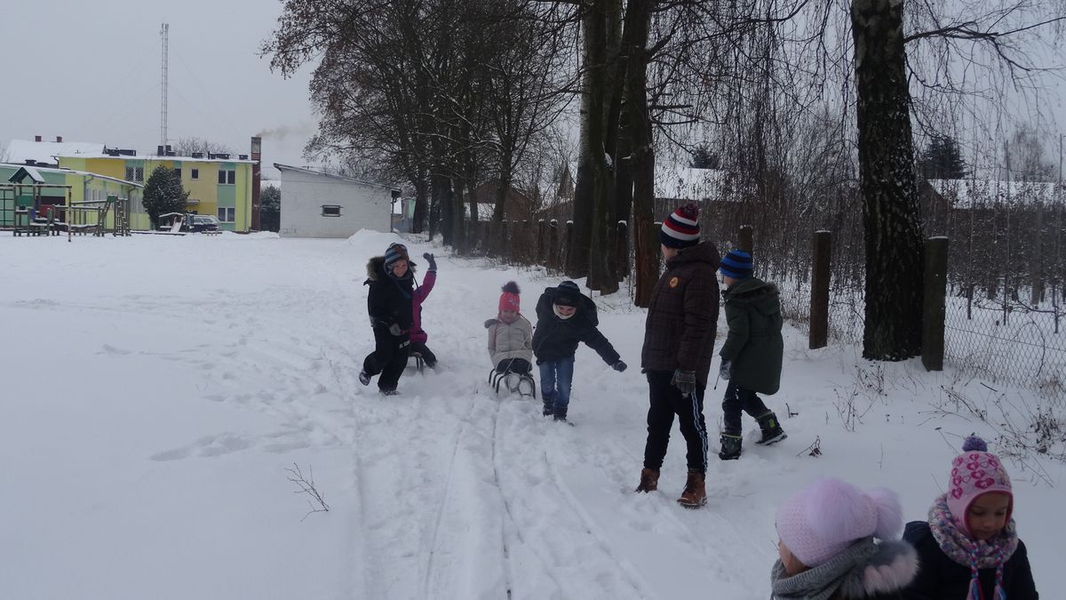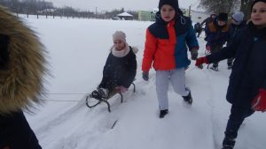 Gdy pogoda sprzyja, często na zajęciach świetlicowych wychodzimy z uczniami na boisko szkolne lub na spacer po lesie. Zimowa aura dopisała, więc staramy się korzystać z uroków pięknej zimy. W czwartkowe popołudnie pierwszoklasiści wybrali się na sanki. Podczas zabawy nikomu nie było zimno. Wielką frajdą okazało się zjeżdżanie z „górki na pazurki”, a także wspinanie się na nią. Zwieńczeniem zabawy była bitwa na śnieżki. Od dawna wiadomo, że wszyscy uwielbiają zimowe szaleństwa na śniegu.