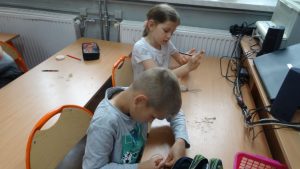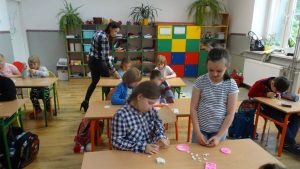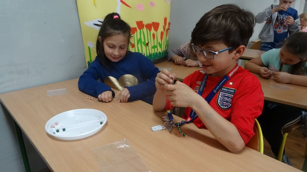 W tygodniu poprzedzającym Dzień Mamy uczniowie klasy I i klas II szkoły podstawowej uczestniczyli w warsztatach robienia biżuterii. Na zajęcia świetlicowe wychowawcy zaprosili panią Monikę Tomczyk, która na co dzień tworzy różne „cudeńka” z koralików i nie tylko. Pani Monika pokazała jak samodzielnie zrobić coś pięknego. Własnoręcznie wykonane bransoletki i kolczyki były niespodzianką dla mam.