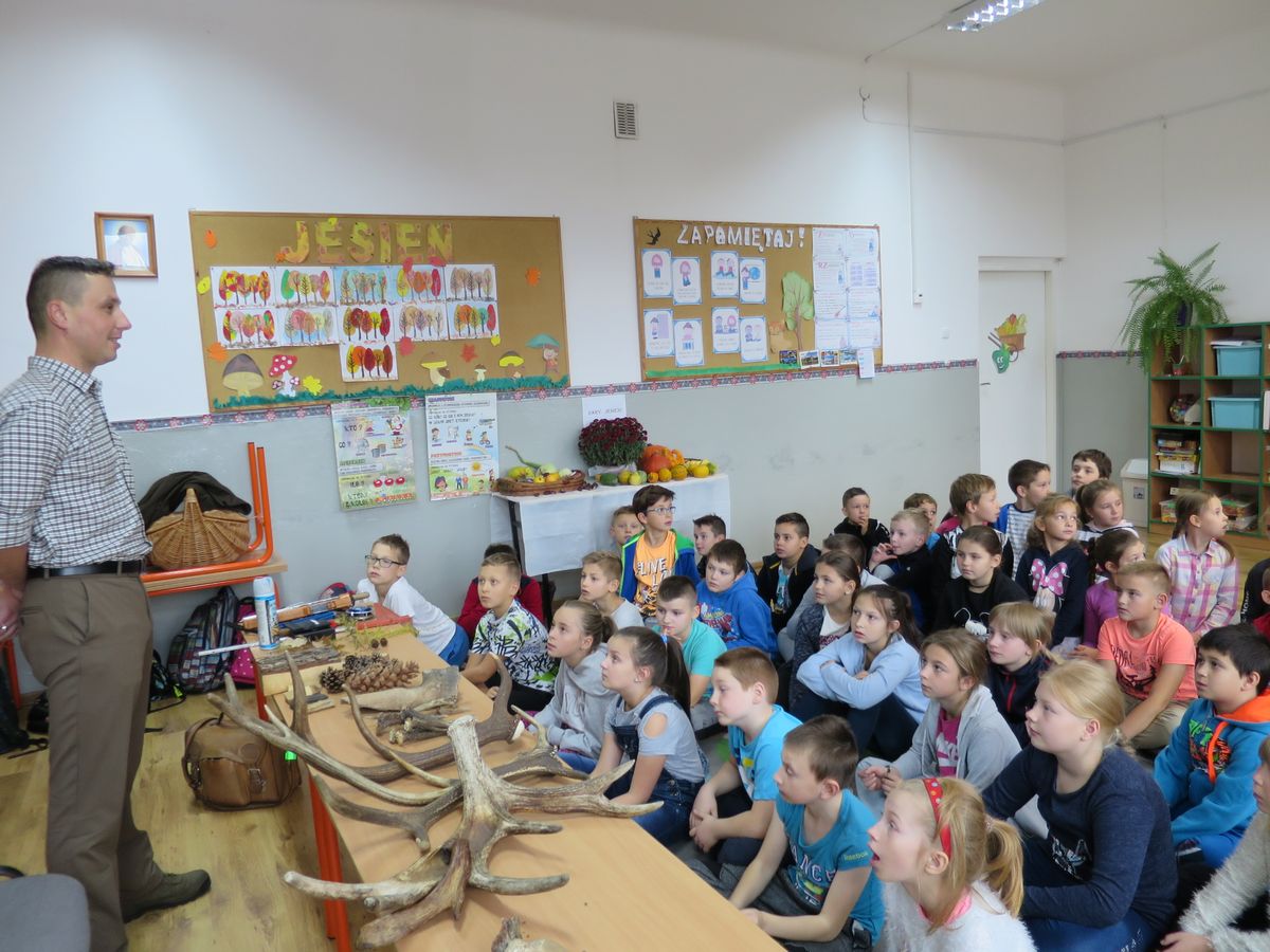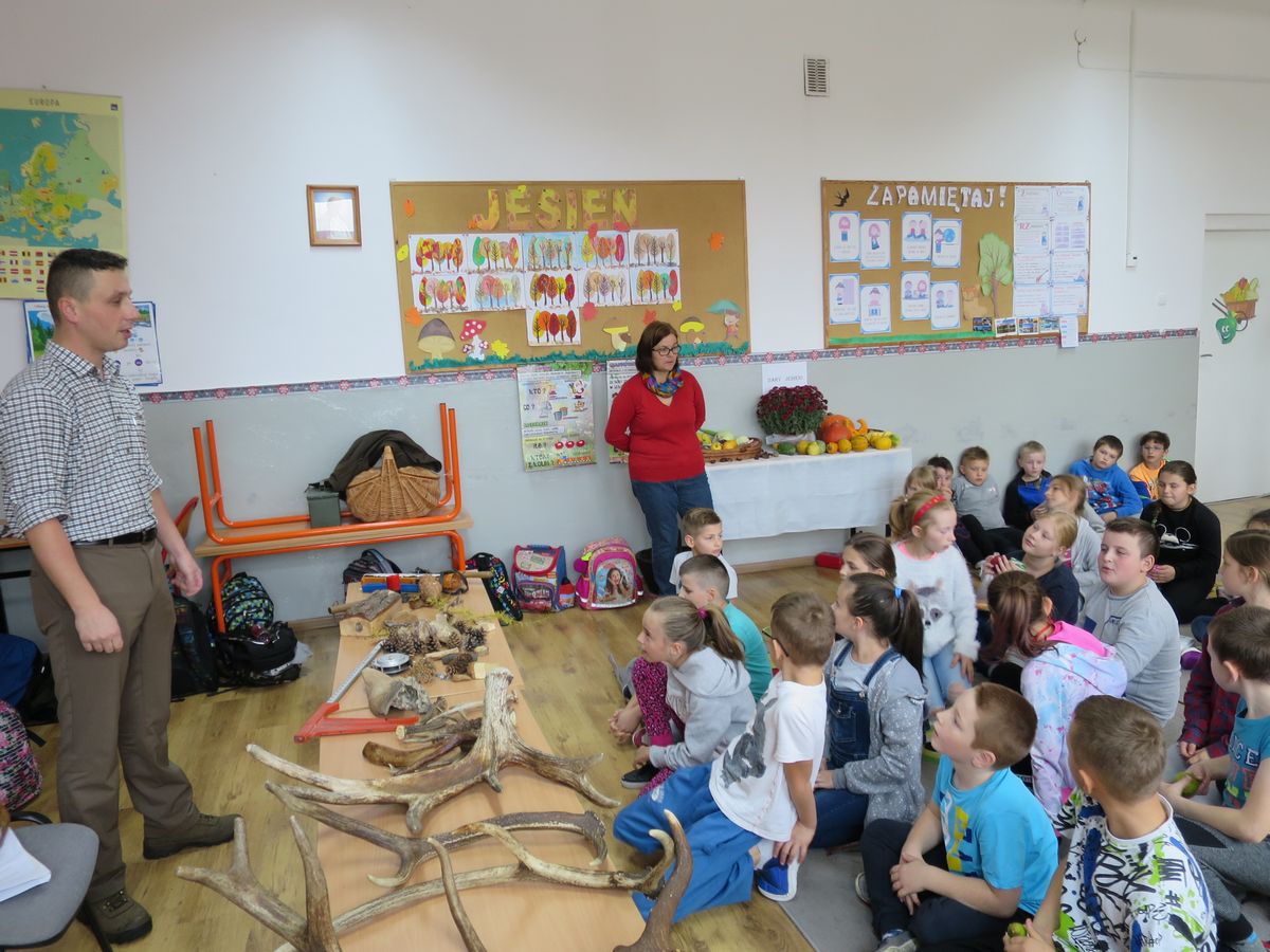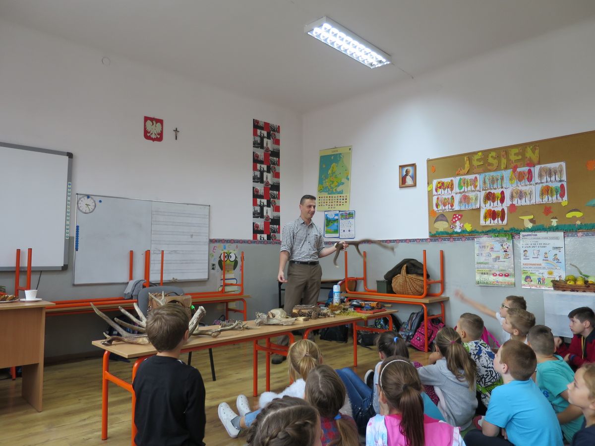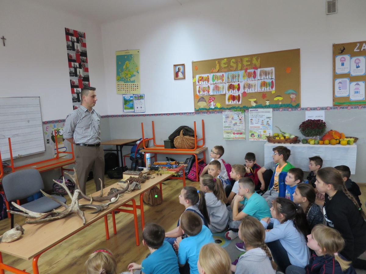 W dniu 07.11.2019 r. uczniów klas II i III odwiedził niezwykły gość, pan leśniczy Krzysztof Kowalczyk.  Podczas spotkania uczniowie mieli okazję poznać na czym polega praca leśniczego oraz  możliwość obejrzenia przyrządów jakimi posługuje się w codziennej pracy. Dzieci  dowiedziały się, również o zwyczajach dzikich zwierząt zamieszkujących nasze okolice. Uczniowie utrwalili nazwy drzew na których rosną żołędzie, kasztany, jarzębina, szyszki oraz dowiedziały się jakie drzewo gubi na zimę igły.