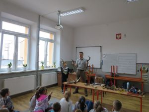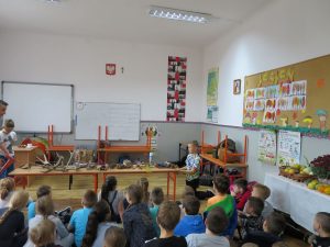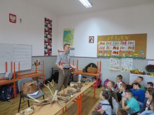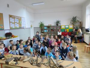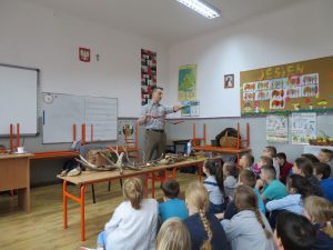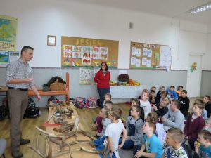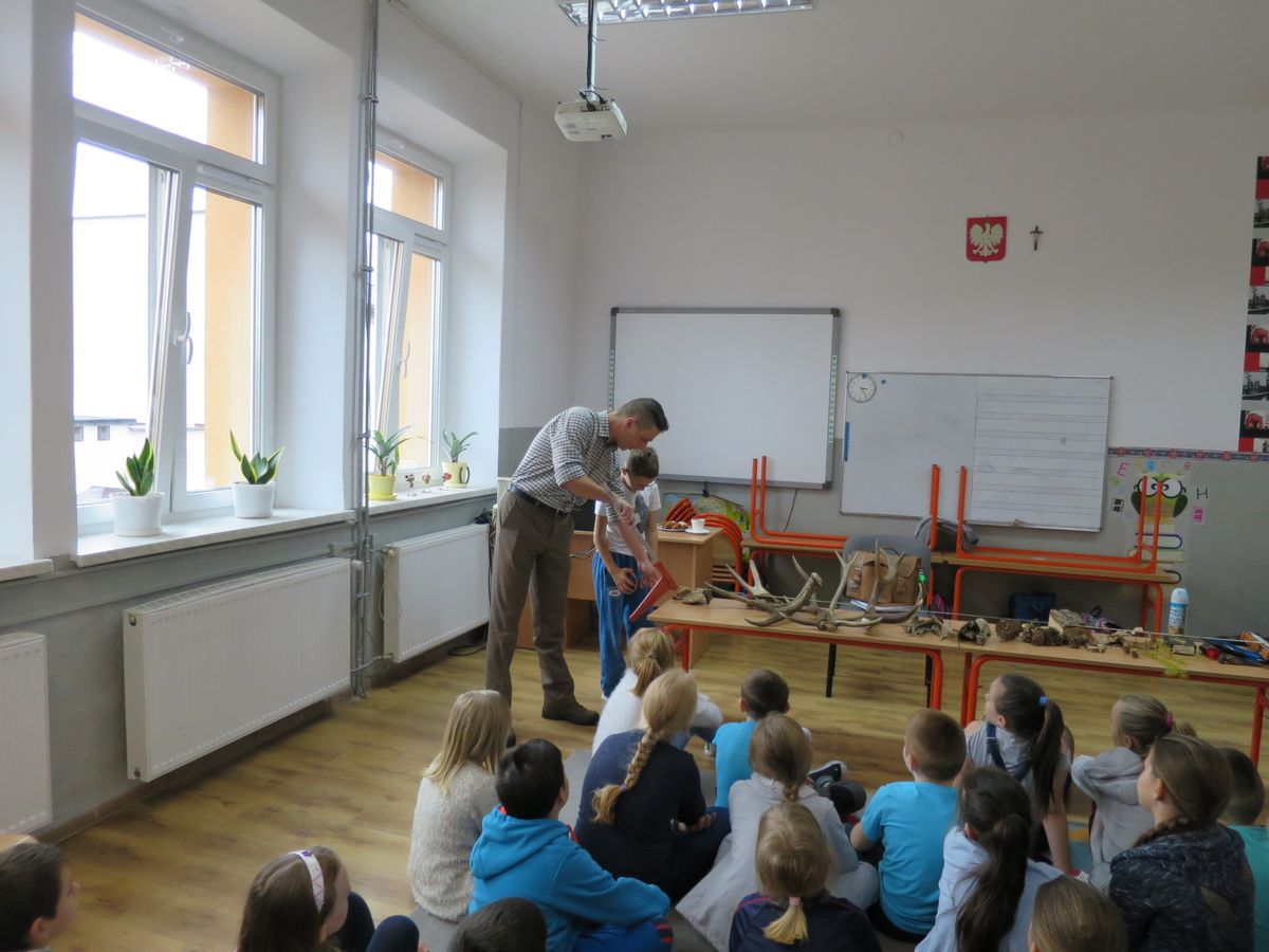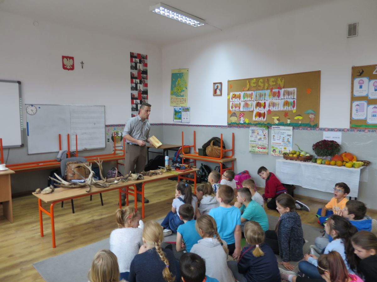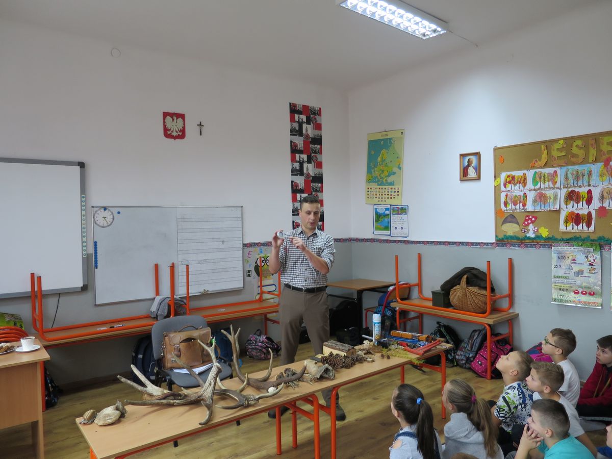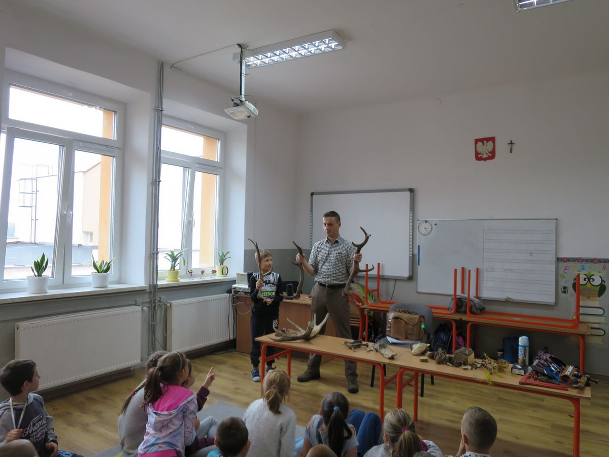 W dniu 07.11.2019 r. uczniów klas II i III odwiedził niezwykły gość, pan leśniczy Krzysztof Kowalczyk.  Podczas spotkania uczniowie mieli okazję poznać na czym polega praca leśniczego oraz  możliwość obejrzenia przyrządów jakimi posługuje się w codziennej pracy. Dzieci  dowiedziały się, również o zwyczajach dzikich zwierząt zamieszkujących nasze okolice. Uczniowie utrwalili nazwy drzew na których rosną żołędzie, kasztany, jarzębina, szyszki oraz dowiedziały się jakie drzewo gubi na zimę igły.