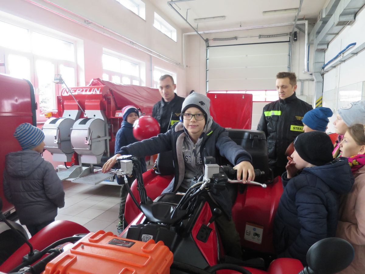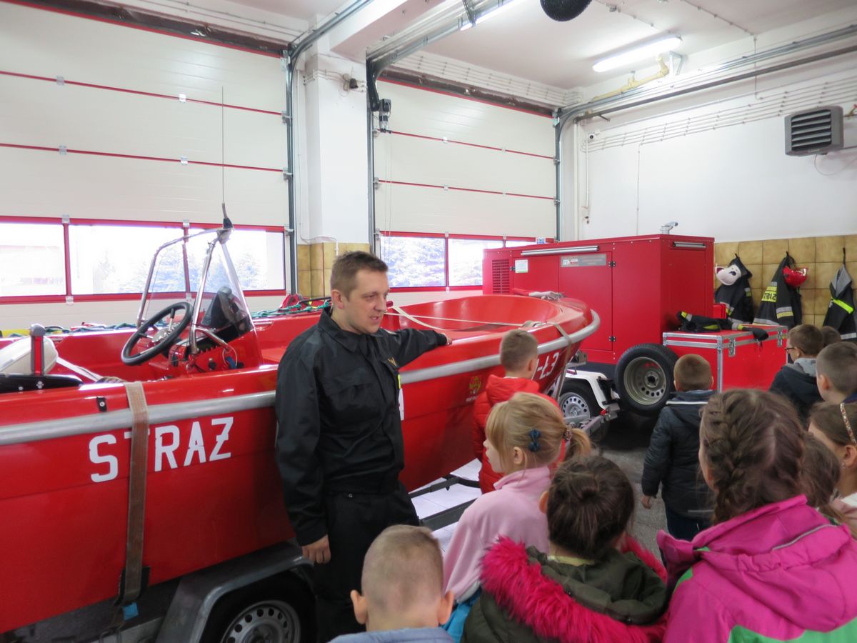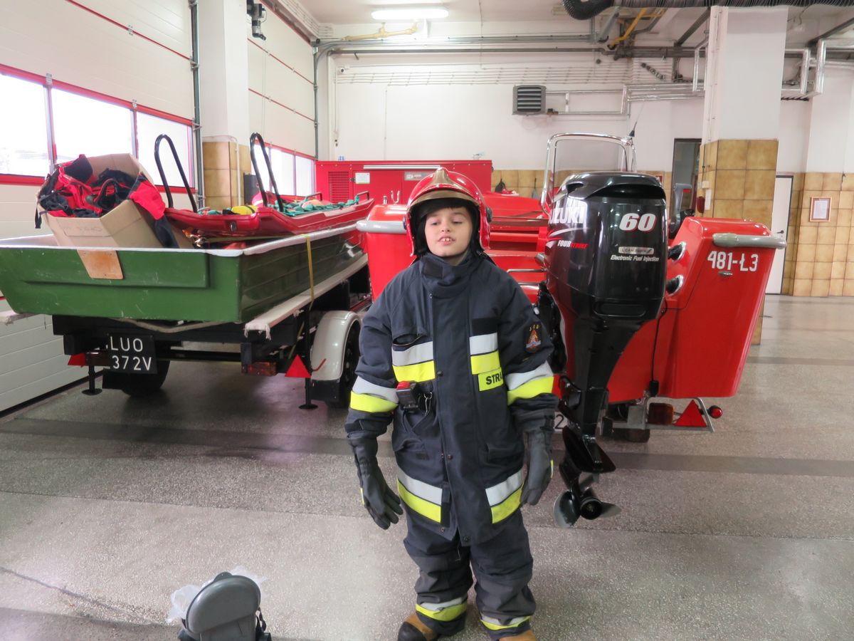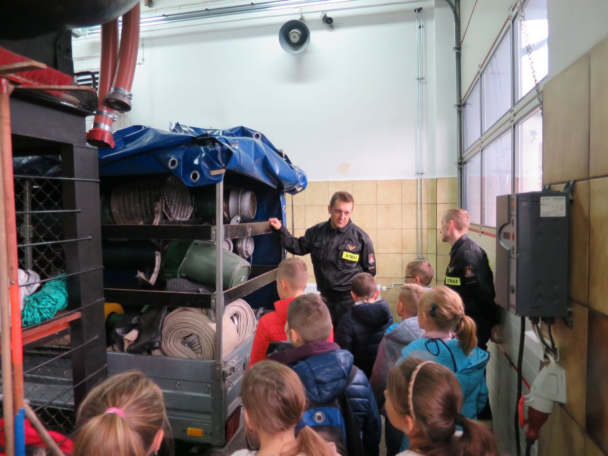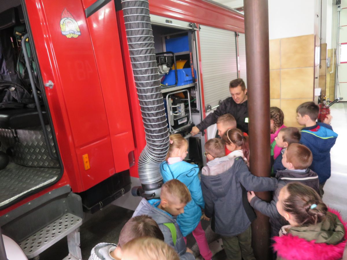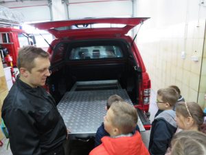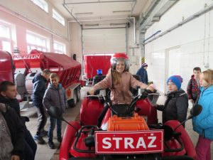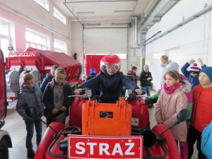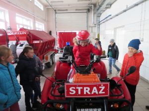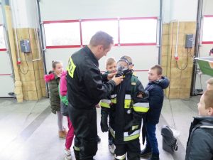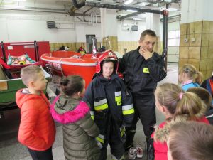 Podczas spotkania zwiedzaliśmy pomieszczenia takie jak : stołówka, siłownia, miejsce odpoczynku strażaków, miejsce dowodzenia oraz garaże, w których mogliśmy nie tylko obejrzeć z bliska i przymierzyć strój strażaka ale także poznać dokładnie wyposażenie samochodu strażackiego.