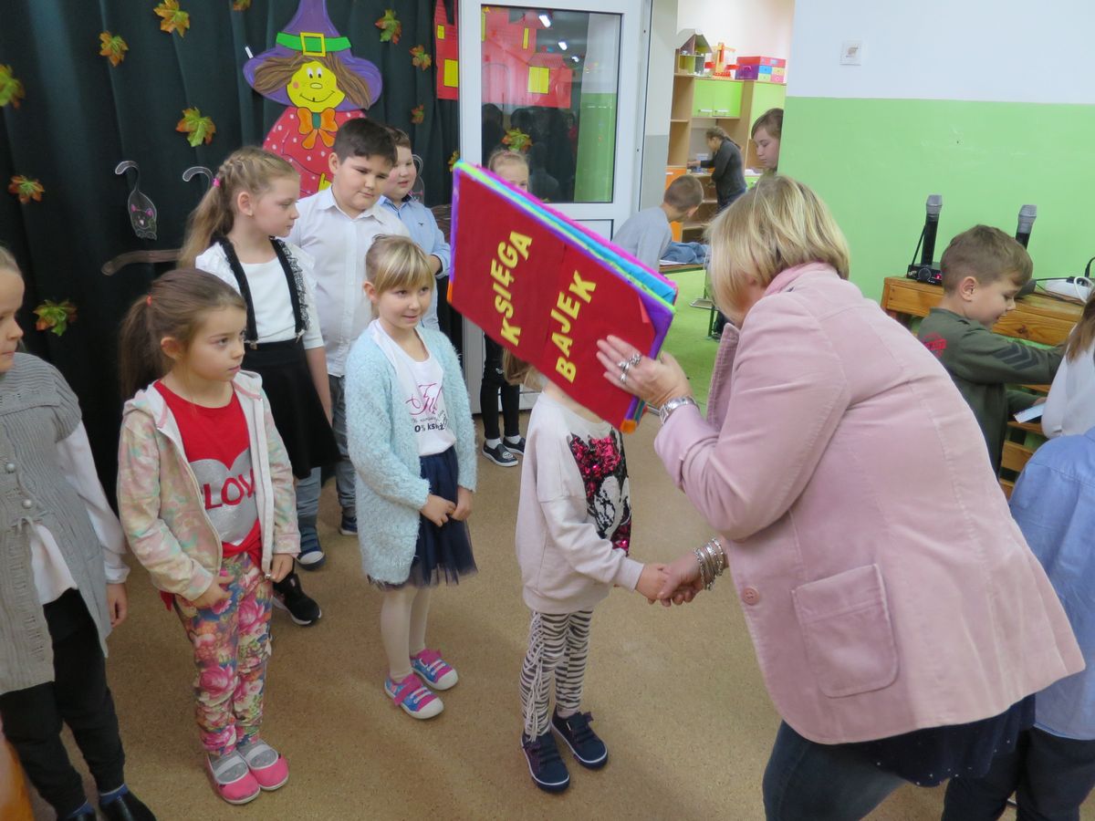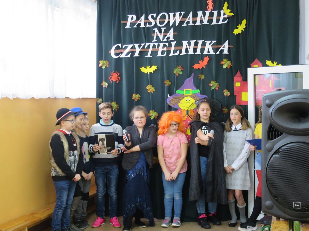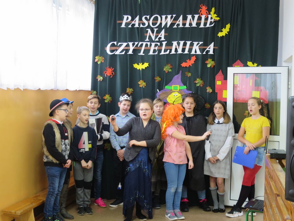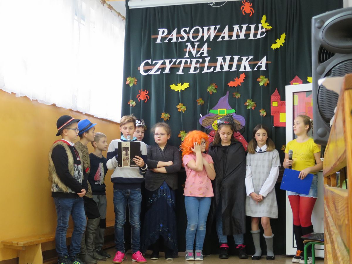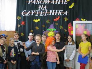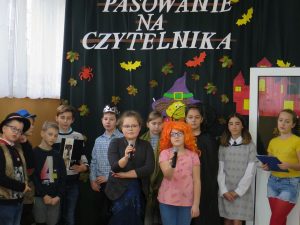 Na początku grudnia w naszej szkole odbyło się uroczyste pasowanie uczniów klasy I na czytelników biblioteki szkolnej. Uczniowie klasy V, pod kierunkiem pani bibliotekarki Anny Starek, przygotowali dla swoich młodszych kolegów inscenizację pod tytułem  „Królowa książka”. Królową biblioteki  odwiedziły rożne postacie z ulubionych książek. Na scenie można było zobaczyć Kota w butach, Szewczyka Dratwekę, Pipi Pończoszankę,  dobrą wróżkę oraz Anię z Zielonego Wzgórza. Bohaterowie zastanawiali się czy „pierwszaki” wiedzą jak obchodzić się z książkami i jak zachowywać się w bibliotece. Zrobili maluchom ciekawy test, który okazał się dla nich bardzo łatwy. Wszyscy oczywiście zdali  śpiewająco i zostali uroczyście pasowani na czytelników biblioteki szkolnej. Cała klasa otrzymała pamiątkowe zakładki do książek oraz okolicznościowy dyplom.