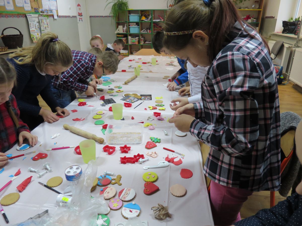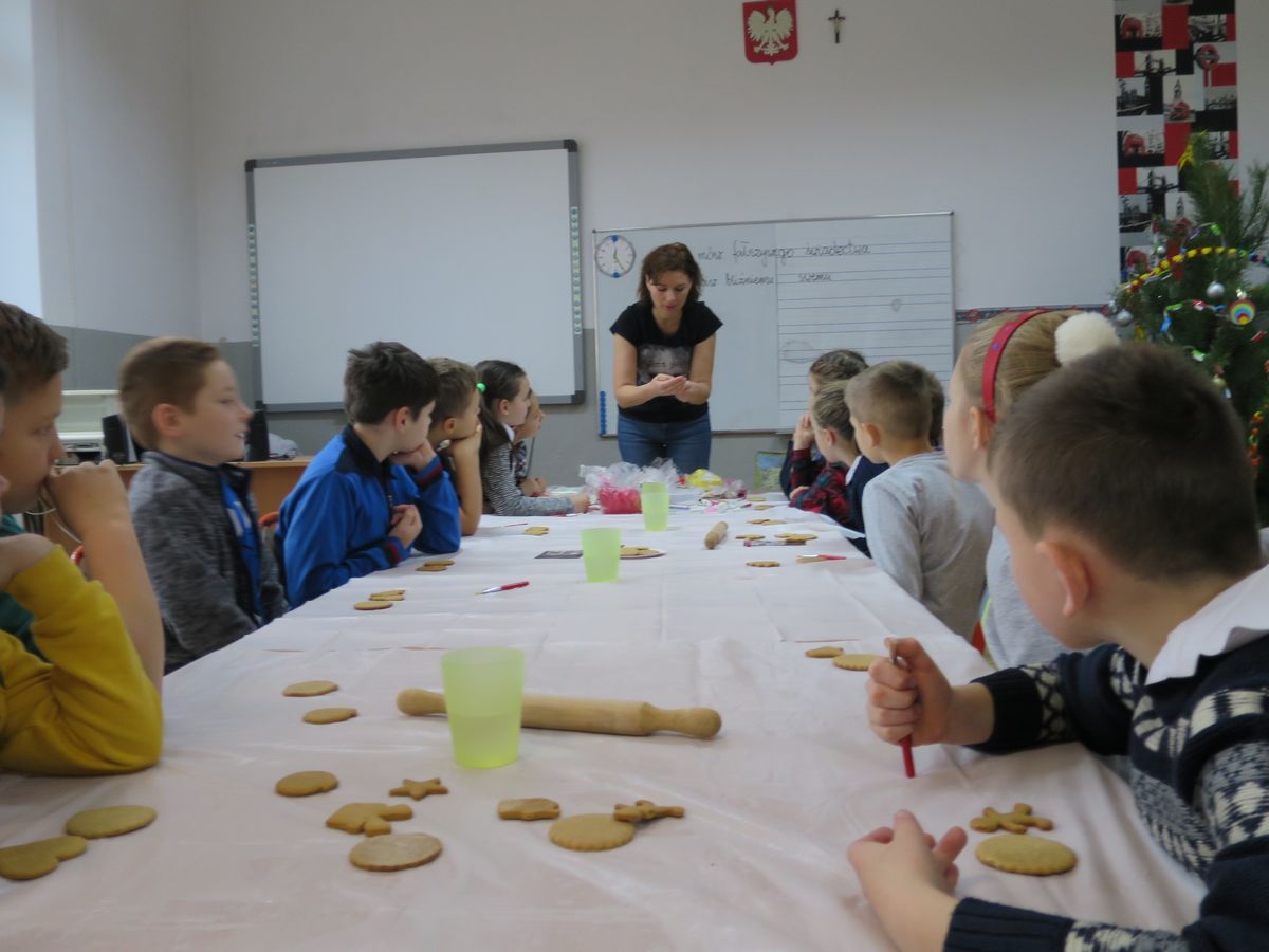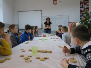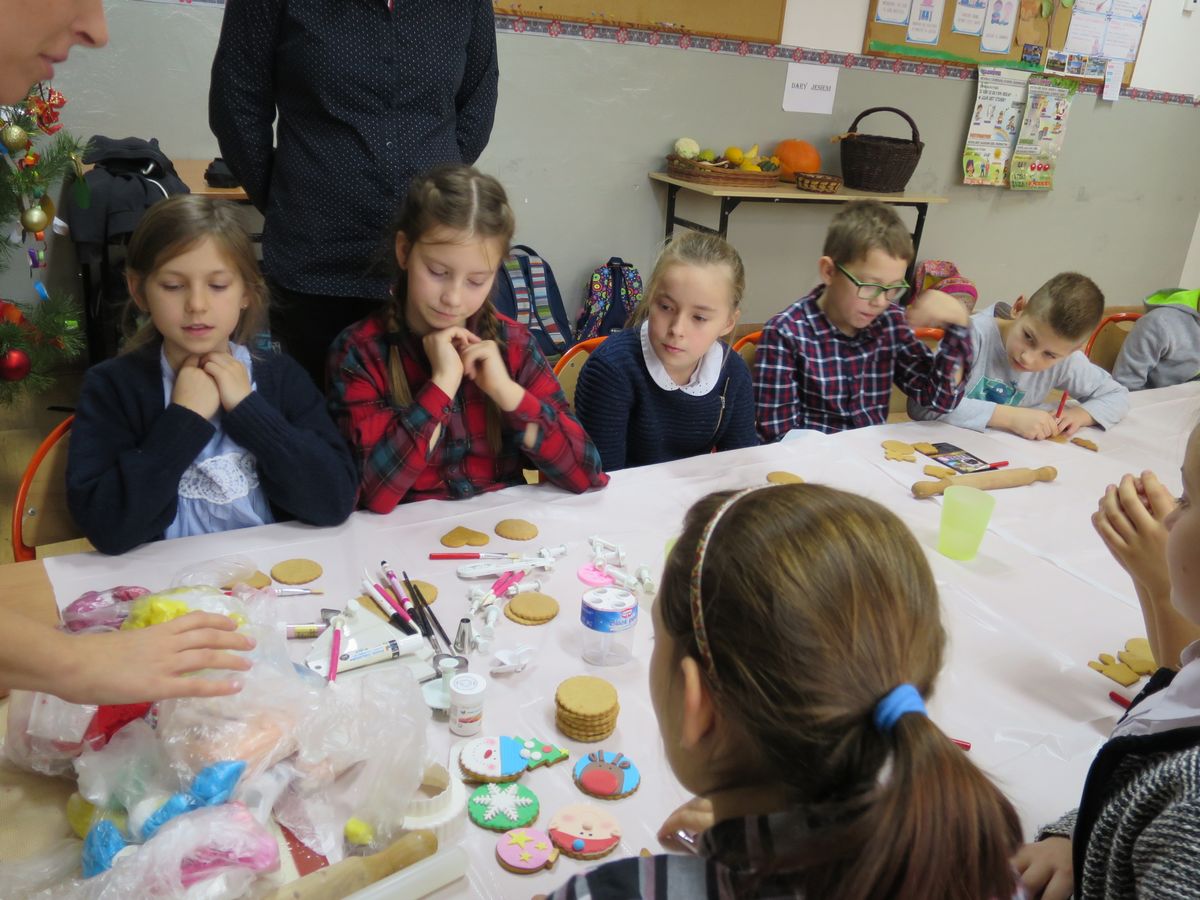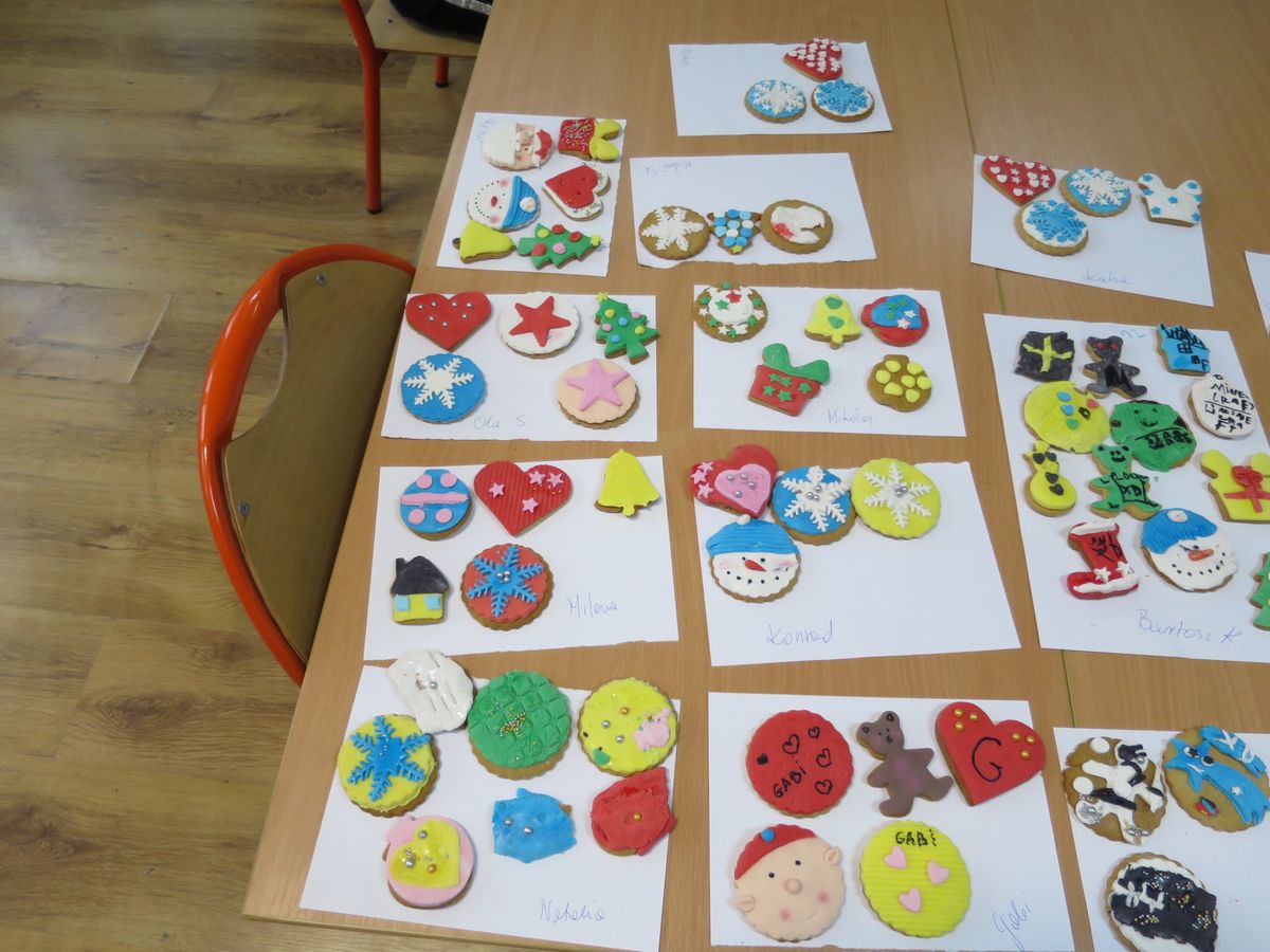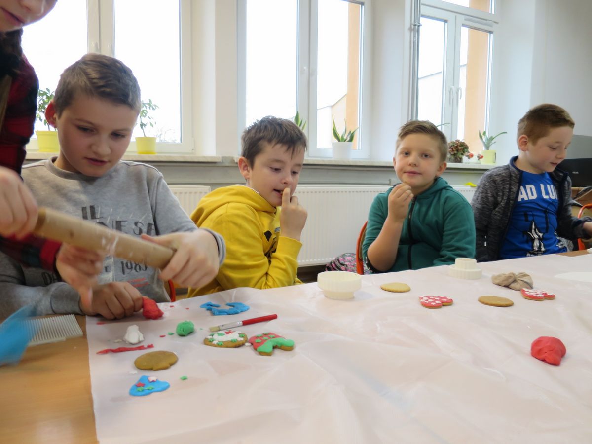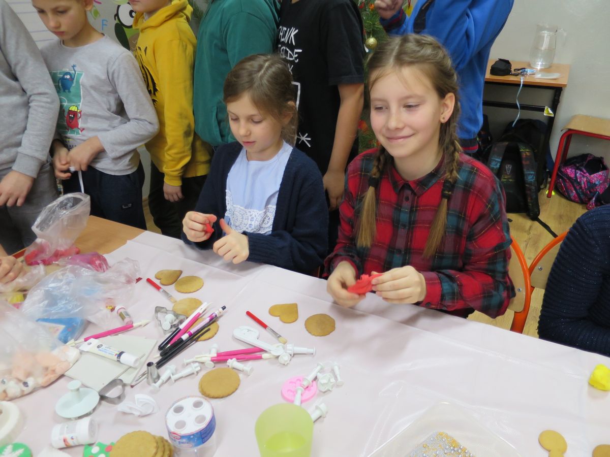 9 grudnia 2019r. w klasie III bi odbyły się warsztaty cukiernicze przeprowadzone przez panią Annę Budkowską. Uczniowie mieli okazję zapoznać się z zawodem cukiernika oraz samodzielnie udekorować pierniczki, które pani Ania upiekła na tę okazję. Dzieci uczyły się, jak należy wyrabiać masę lukrową, jak używać wałka do ciasta, foremek i innych narzędzi cukierniczych. Uczniowie z wielkim zaangażowaniem i z wielkim zapałem zabrali się za zdobienie pierniczków. Udekorowane pierniczki wyglądały bardzo apetycznie.