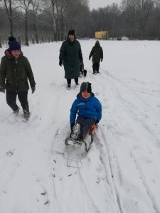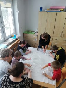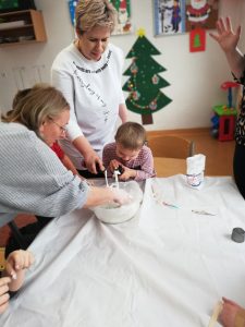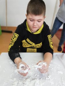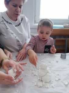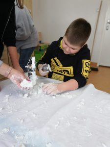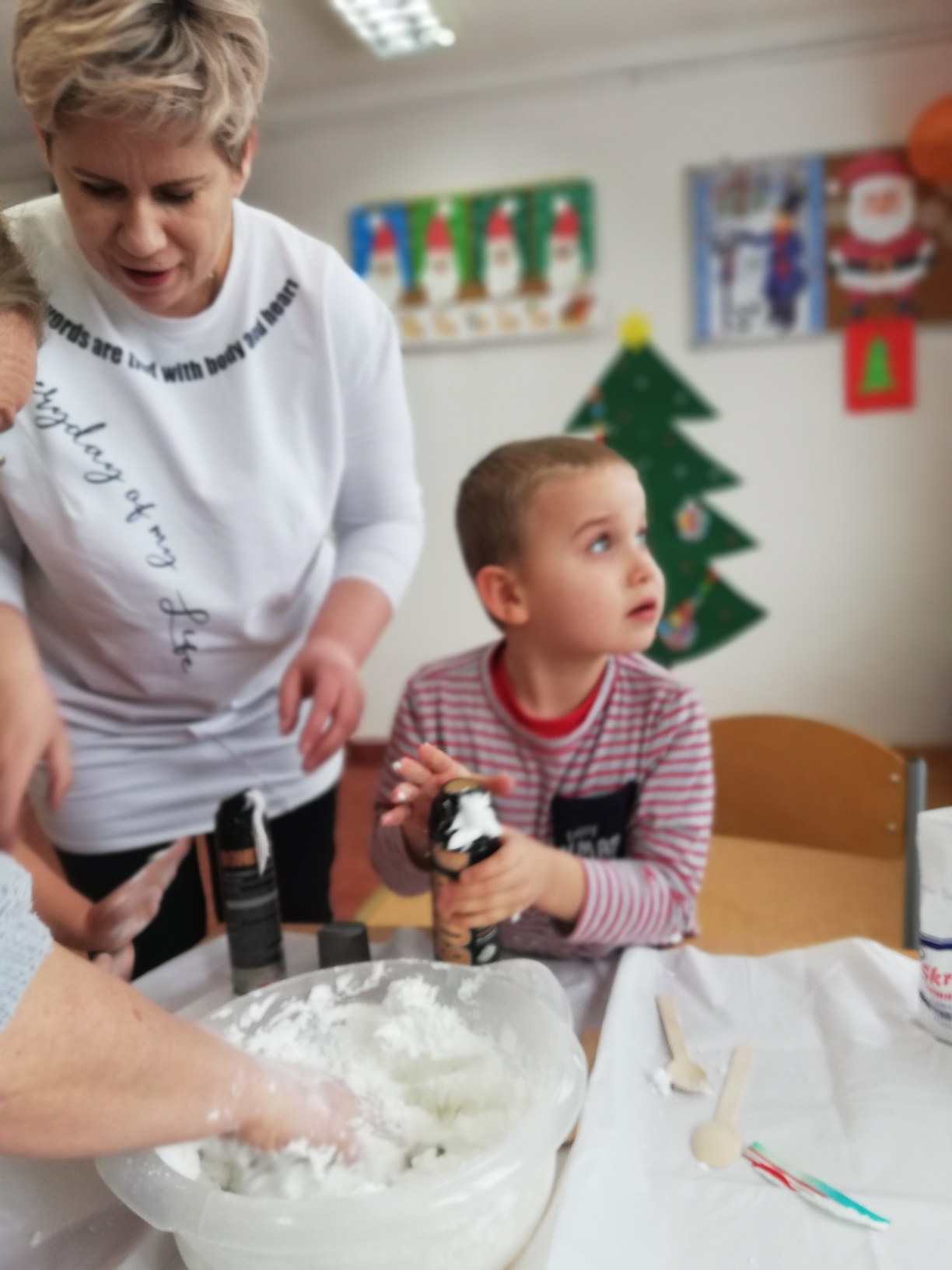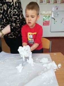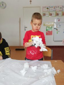 Nie od dzisiaj wiadomo, że śnieg kochają wszystkie dzieci. Dlatego też i w naszym przedszkolu nie mogliśmy pominąć tego święta. W tym dniu dzieciom towarzyszyła świetna zabawa. Dowiedziały się jakiego kształtu są płatki śniegu, a wykonując doświadczenia dowiedziały się co się dzieje ze śniegiem, gdy przyniesiemy go do ciepłej sali. Jednak największą atrakcją dla dzieci było wykonanie sztucznego śniegu, z którego ulepiły bałwanki. Tego dnia pogoda nam dopisała, był upragniony przez nas wszystkich śnieg, dlatego dzieci pod opieką swoich pań wybrały się na spacer oraz saneczkowe wyścigi. Wszyscy bardzo chętnie uczestniczyli w zabawach, które rozwijały wyobraźnię i wprawiły w dobry nastrój.