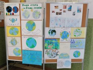 Chętni uczniowie naszej szkoły wykonali plakaty i zdjęcia na temat „Przywróć naszą Ziemię”. Powstały bardzo ciekawe prace. Wystawa prac znajduje się na dolnym korytarzu naszej szkoły. A uczniowie przebywający w szkole wraz z nauczycielami posprzątali teren wokół szkoły.