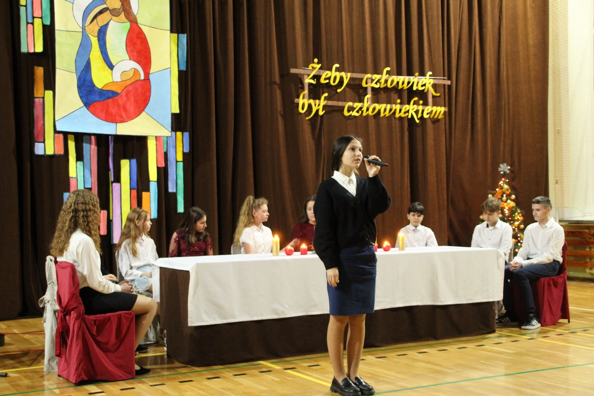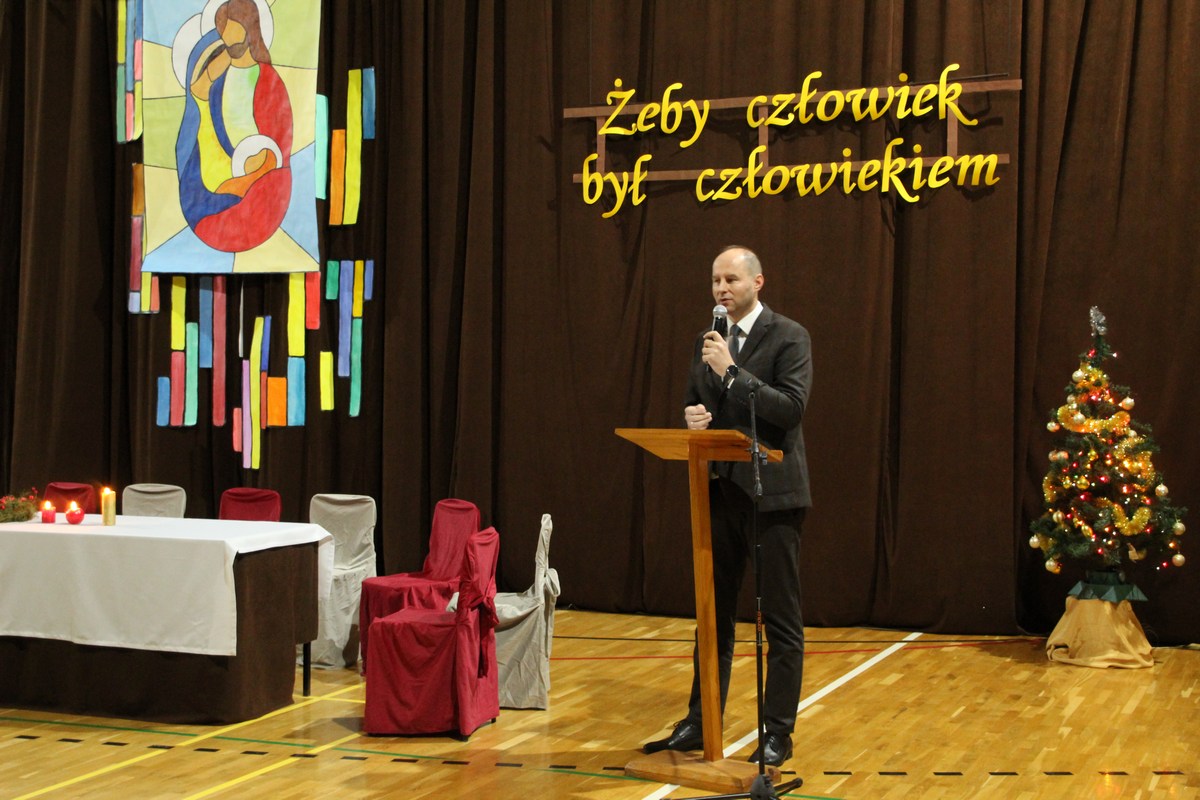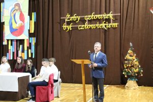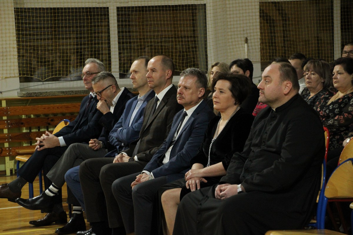 Dnia 5 stycznia br. odbyło się w naszej szkole uroczyste spotkanie noworoczne. Swoją obecnością zaszczycił nas pan burmistrz – Sławomir Plis i jego zastępca Waldemar Gogół. Obecni byli także dyrektor ZEASu – Janusz Gąsior, radny gminy Waldemar Bryś oraz wieloletnia pani dyrektor naszej szkoły – Anna Madej. Piękną część artystyczną pod hasłem „Żeby człowiek był człowiekiem” przygotowali uczniowie najstarszych klas szkoły podstawowej pod kierunkiem p. dyrektor Ewy Pietras, p. Anny Kręcisz-Roli i p. Anny Janoszczyk. Tradycyjne kolędy i pastorałki zaśpiewali uczniowie przygotowani przez pana Vasyla Hubala.