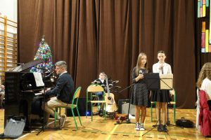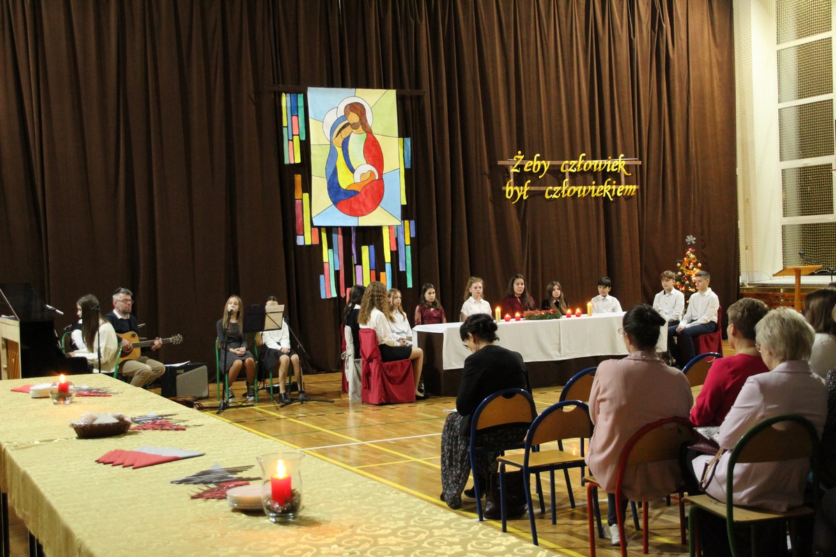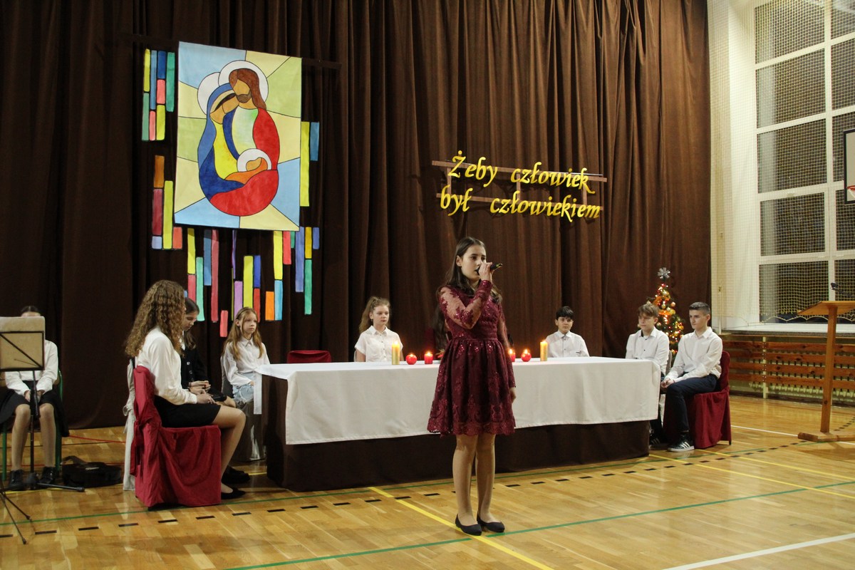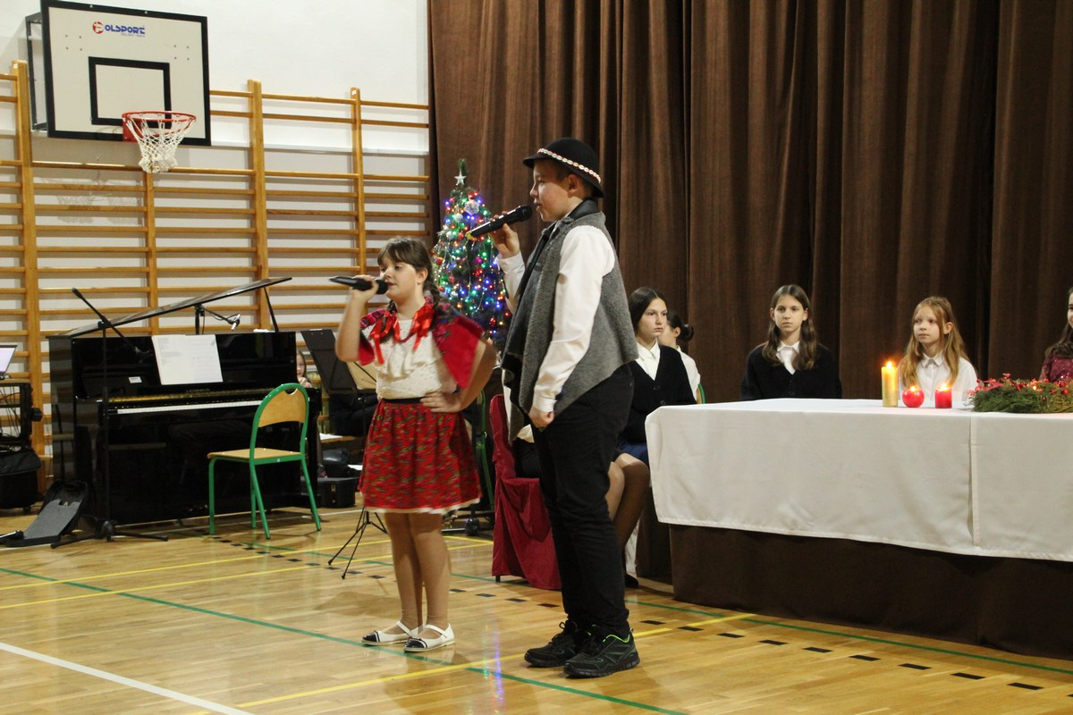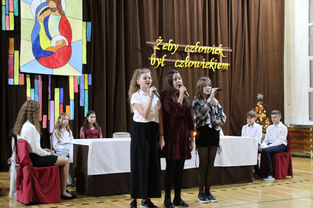 Dnia 5 stycznia br. odbyło się w naszej szkole uroczyste spotkanie noworoczne. Swoją obecnością zaszczycił nas pan burmistrz – Sławomir Plis i jego zastępca Waldemar Gogół. Obecni byli także dyrektor ZEASu – Janusz Gąsior, radny gminy Waldemar Bryś oraz wieloletnia pani dyrektor naszej szkoły – Anna Madej. Piękną część artystyczną pod hasłem „Żeby człowiek był człowiekiem” przygotowali uczniowie najstarszych klas szkoły podstawowej pod kierunkiem p. dyrektor Ewy Pietras, p. Anny Kręcisz-Roli i p. Anny Janoszczyk. Tradycyjne kolędy i pastorałki zaśpiewali uczniowie przygotowani przez pana Vasyla Hubala.