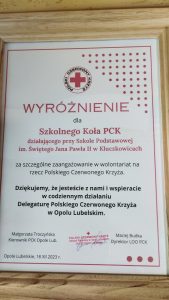 Jest nam tym bardziej miło, iż nasze Koło Wolontariatu i PCK zostało wyróżnione jako jedno z dwóch szkolnych kół za szczególne zaangażowanie w wolontariat.