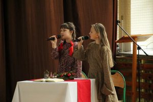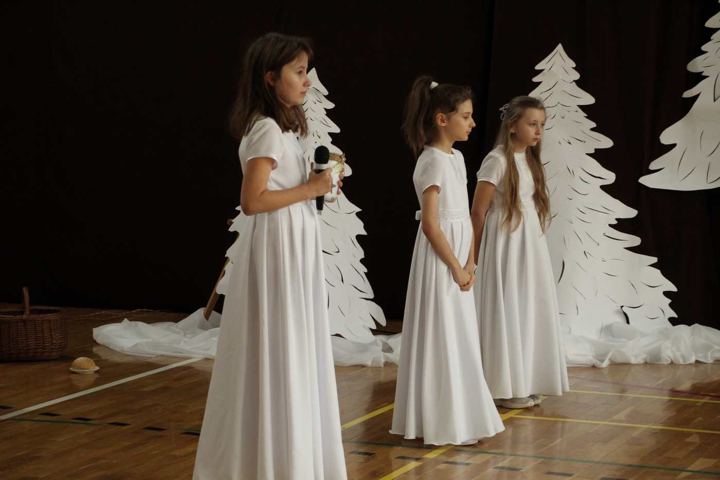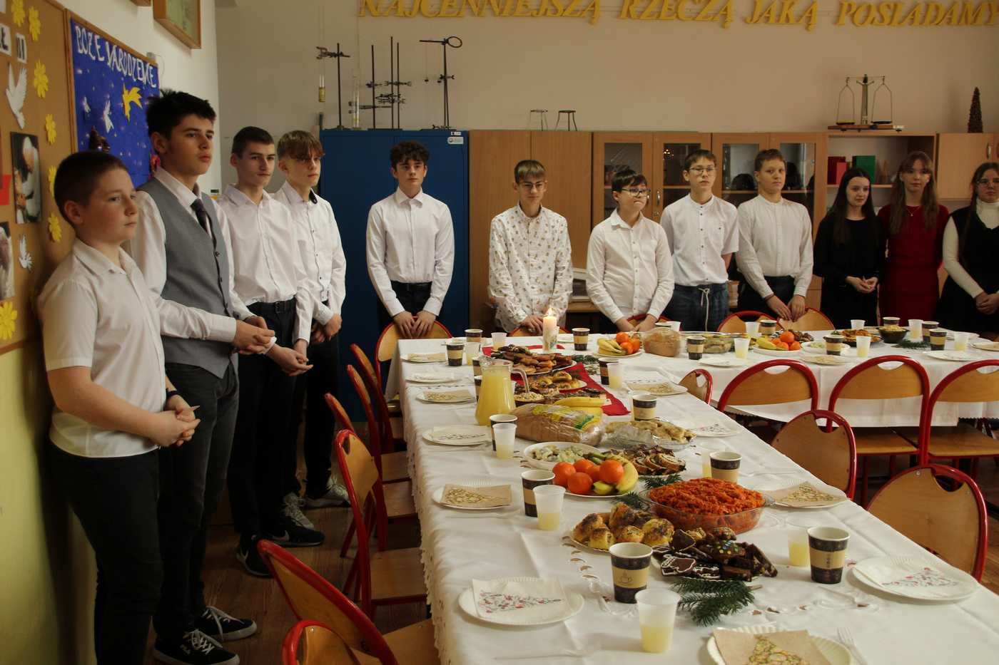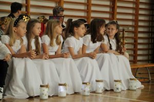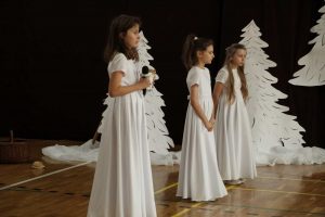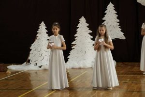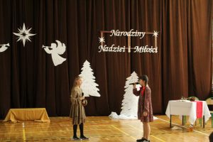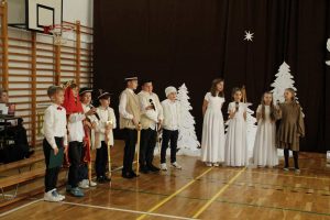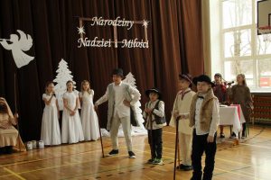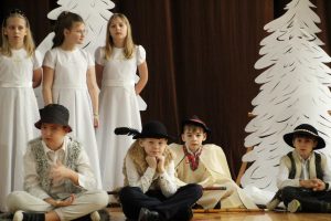 Życzeniami wesołych i spokojnych Świąt od pana dyrektora rozpoczęliśmy piątkowe wspólne kolędowanie. W nastrój świąteczny wprowadzili nas uczniowie klas czwartych wraz z wychowawczyniami i panią katechetką. Piękna inscenizacja tradycyjnych Jasełek zachwyciła wszystkich zgromadzonych, szczególnie tak licznie przybyłych na te okazje rodziców naszych uczniów. Dekoracja wykonana przez nauczycieli świetlicy idealnie dopełniała nastrój  tworząc zimowy pejzaż, którego niestety brakowało za oknem.  Po występach na scenie rozpoczęło się wspólne kolędowanie w klasach przy symbolicznych stołach wigilijnych.