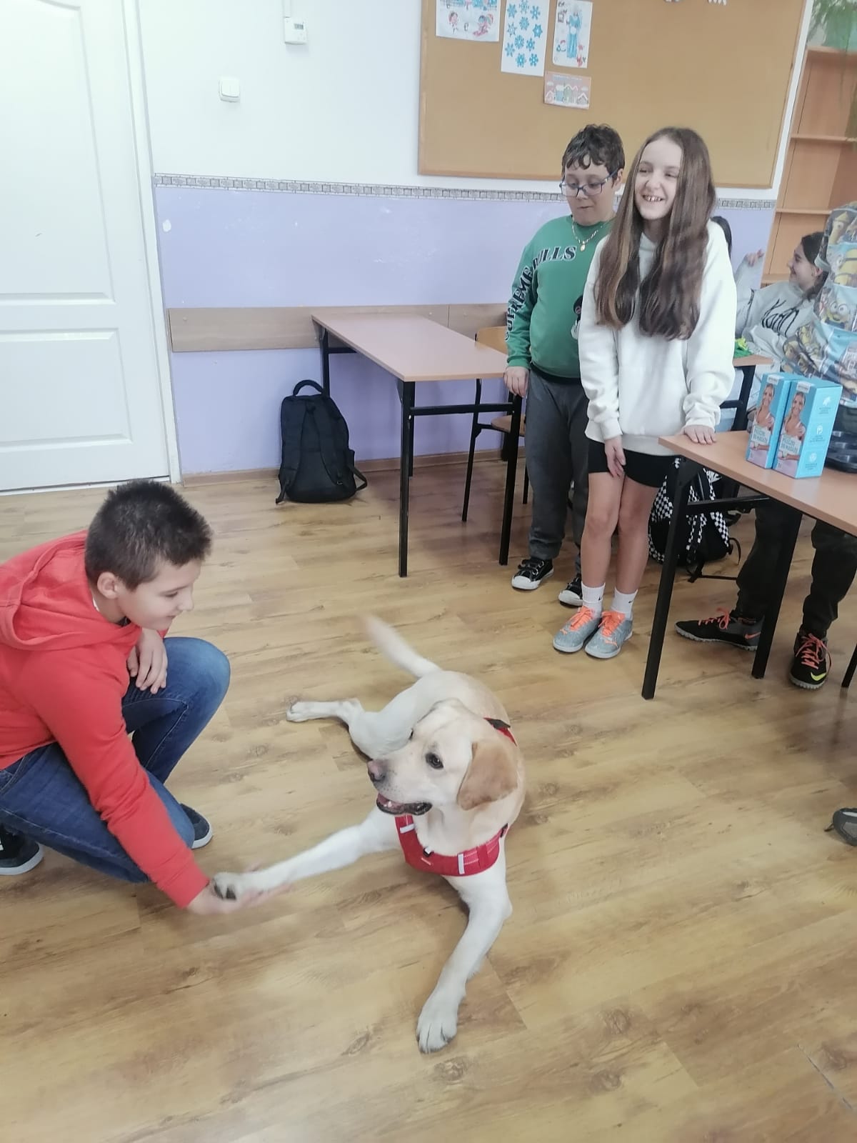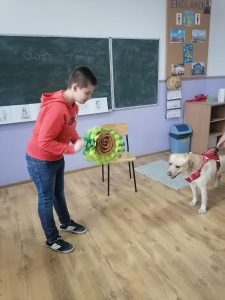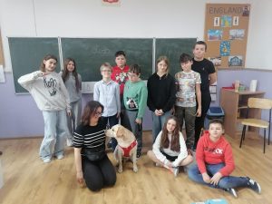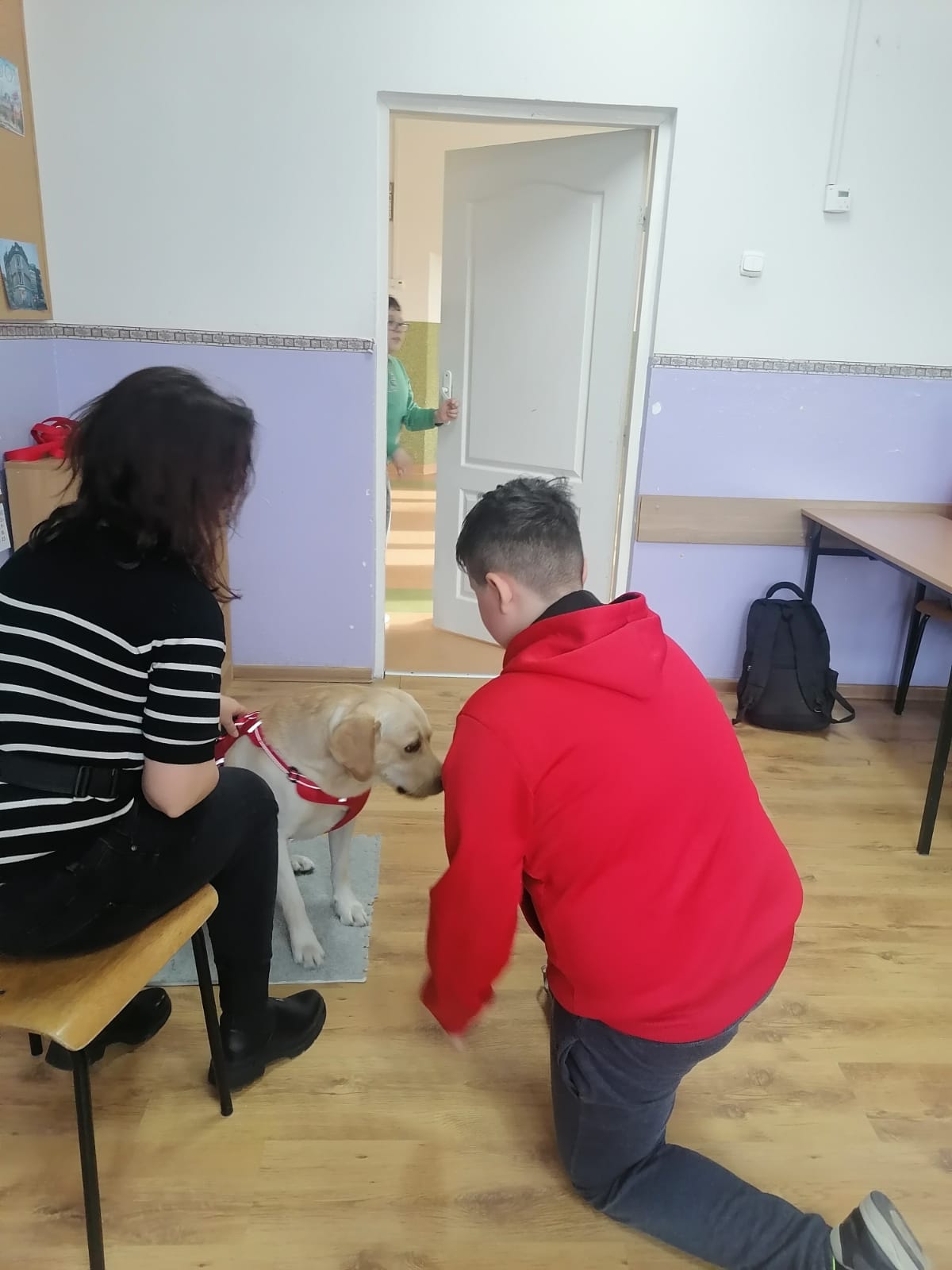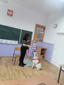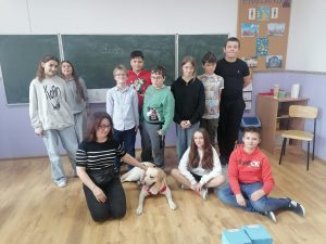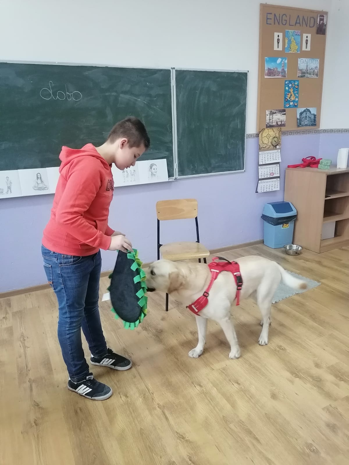 W ramach zajęć na temat ”Bezpiecznego kontaktu z psem” w klasie Vai odbyło się spotkanie uczniów z psem – terapeutą. Na zaproszenie wychowawcy przybył do klasy Lobo (pracownik naszej szkoły) wraz z opiekunem. Uczniowie dowiedzieli się, w jaki sposób należy obchodzić się z psem-terapeutą. Omówili zasady właściwego zachowania się na zajęciach dogoterapii. Punktem kulminacyjnym spotkania był pokaz komend i trików w wykonaniu Lobo. Uczniowie bardzo chętnie wykonywali zadania i opowiadali o swoich czworonożnych pupilach. Wykazali się dużą śmiałością i aktywnie włączyli się w zabawy wymagające współpracy z psem. Lobo dał się poznać jako sympatyczny, przyjacielski i bardzo sprytny pies.