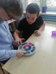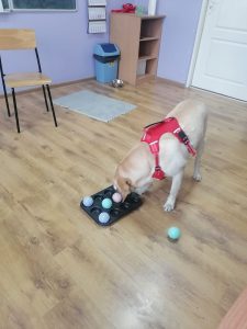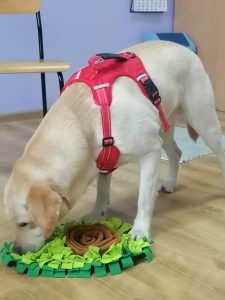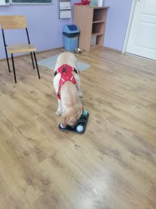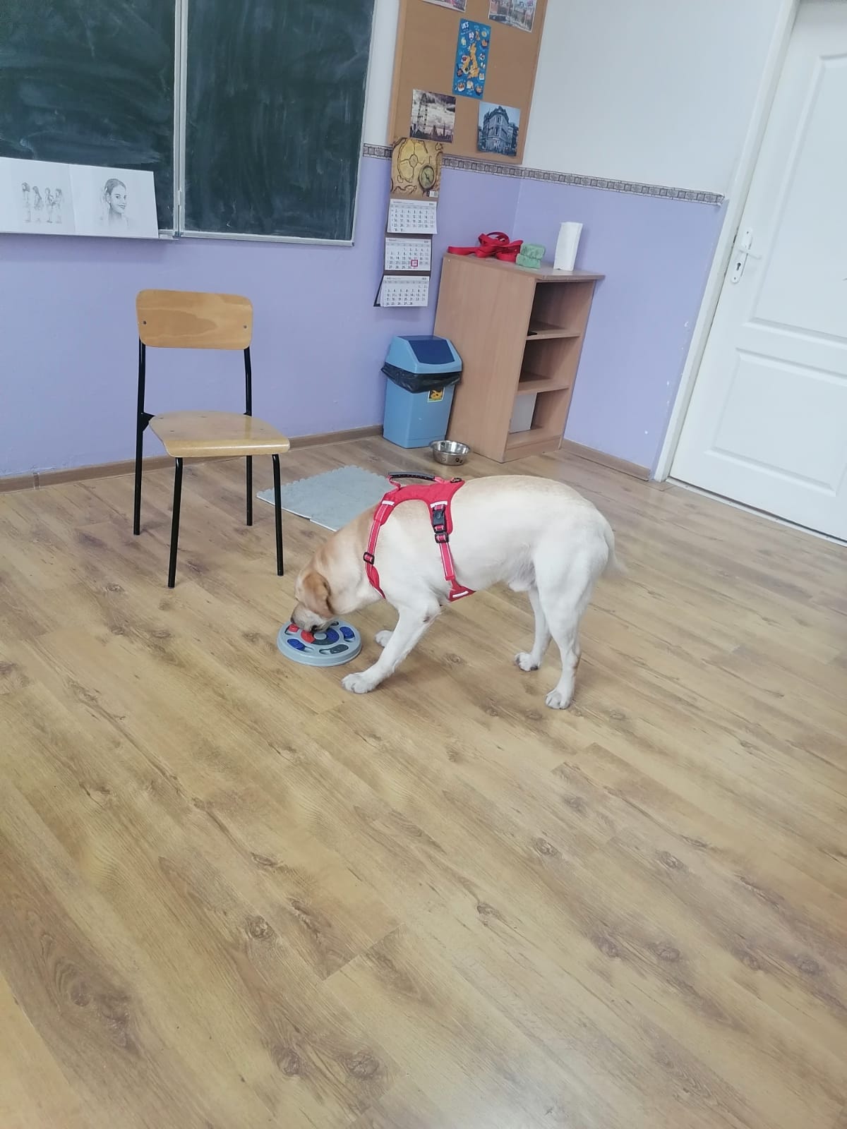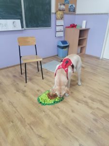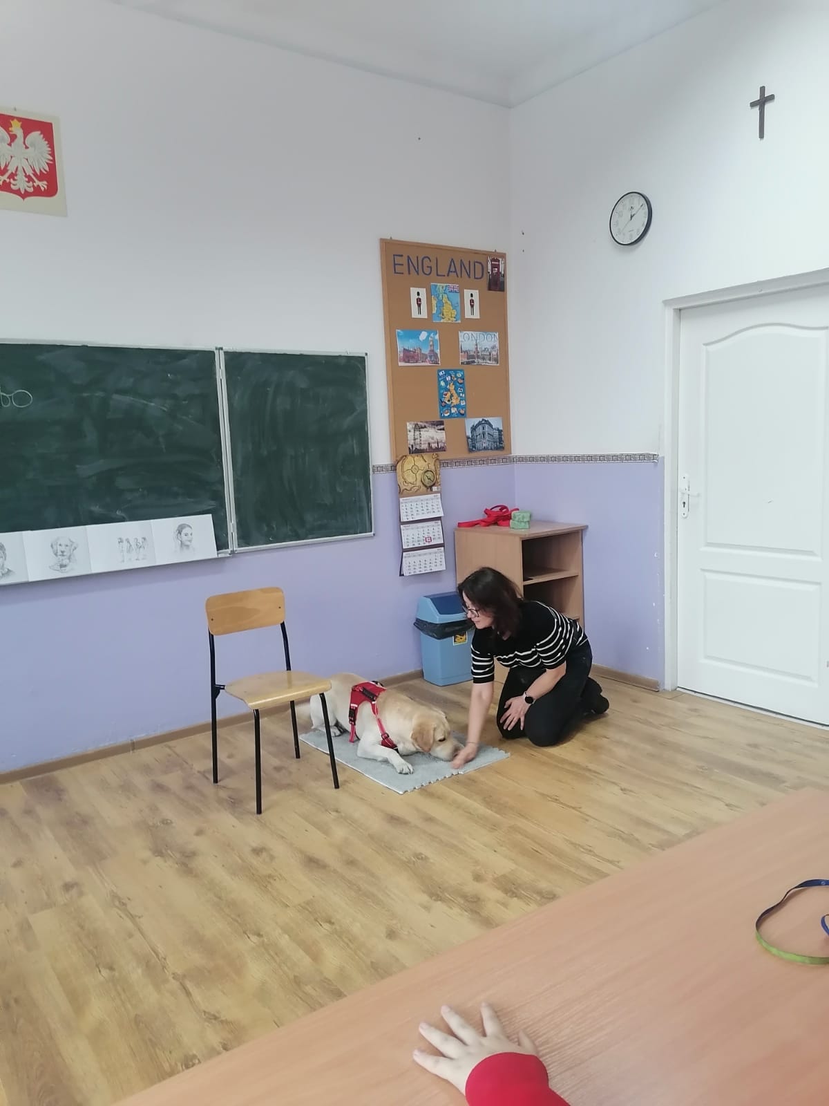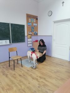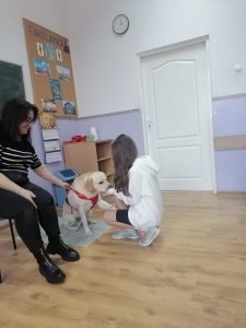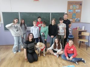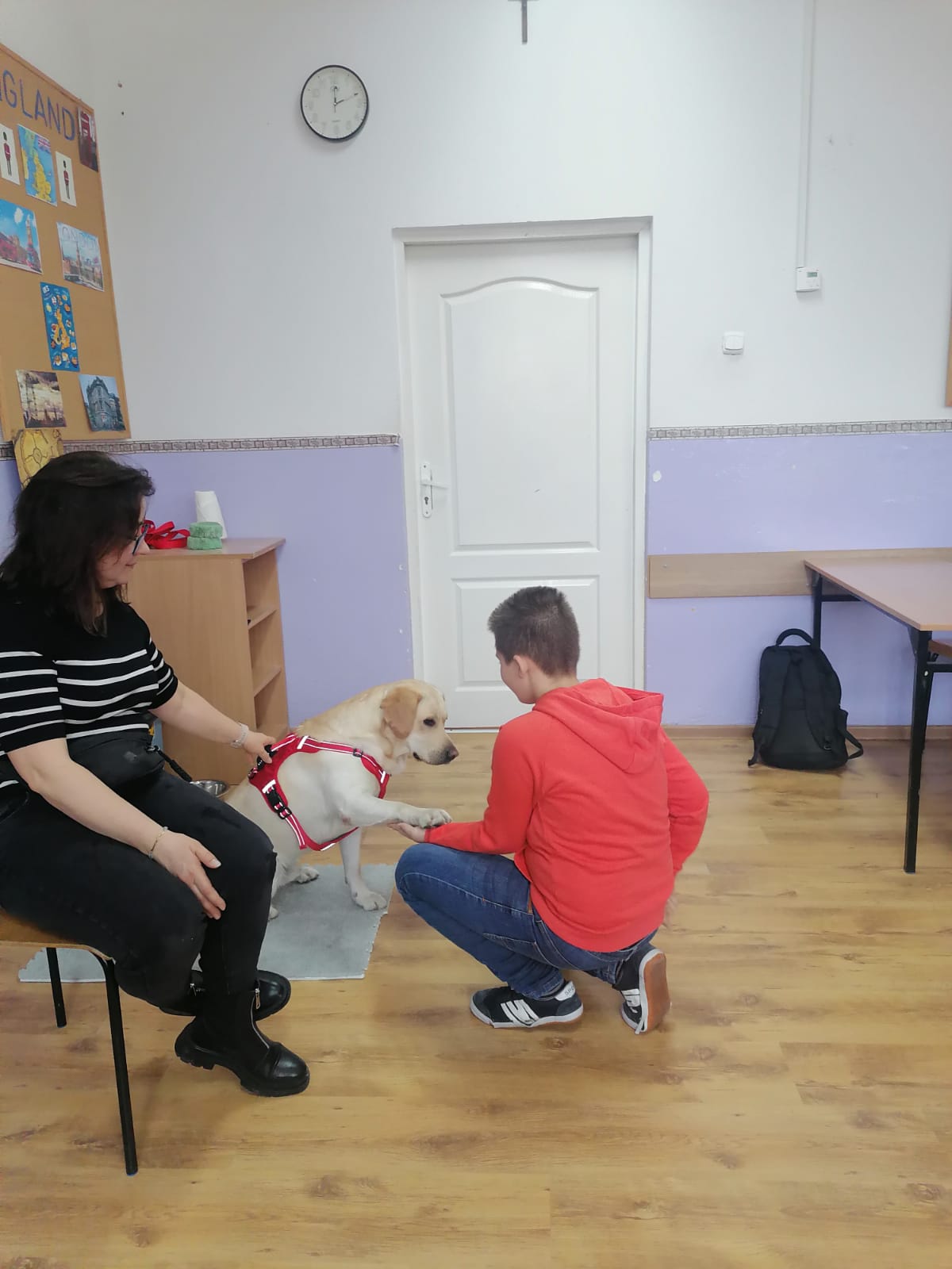 W ramach zajęć na temat ”Bezpiecznego kontaktu z psem” w klasie Vai odbyło się spotkanie uczniów z psem – terapeutą. Na zaproszenie wychowawcy przybył do klasy Lobo (pracownik naszej szkoły) wraz z opiekunem. Uczniowie dowiedzieli się, w jaki sposób należy obchodzić się z psem-terapeutą. Omówili zasady właściwego zachowania się na zajęciach dogoterapii. Punktem kulminacyjnym spotkania był pokaz komend i trików w wykonaniu Lobo. Uczniowie bardzo chętnie wykonywali zadania i opowiadali o swoich czworonożnych pupilach. Wykazali się dużą śmiałością i aktywnie włączyli się w zabawy wymagające współpracy z psem. Lobo dał się poznać jako sympatyczny, przyjacielski i bardzo sprytny pies.