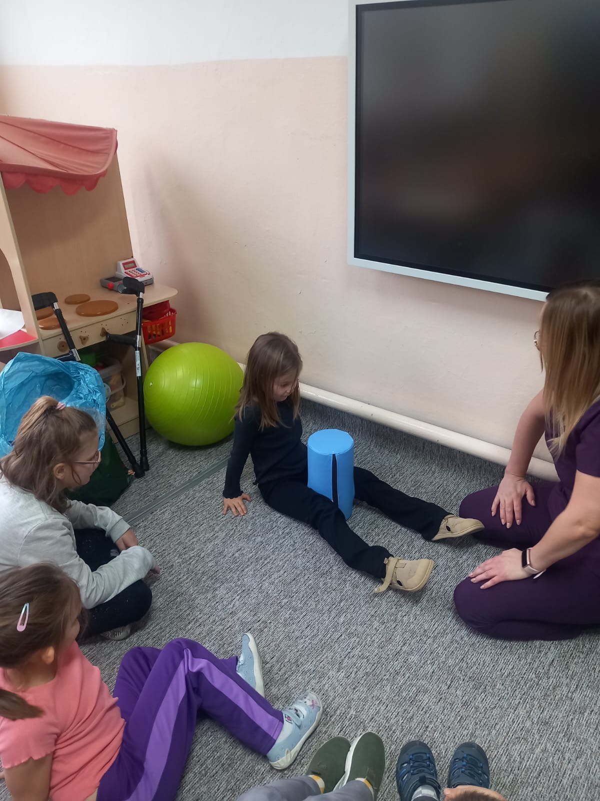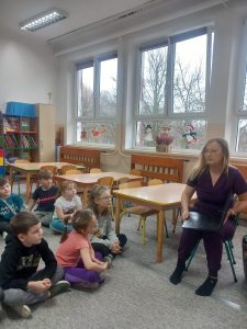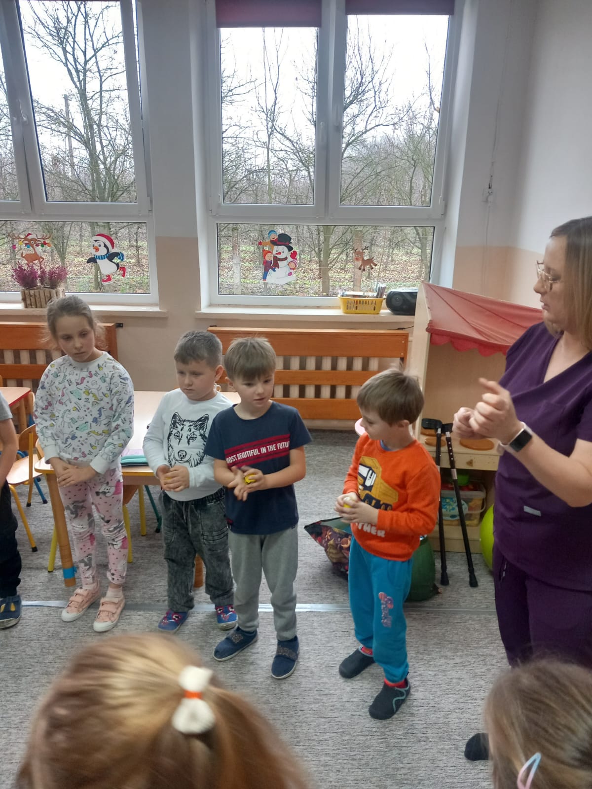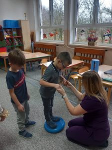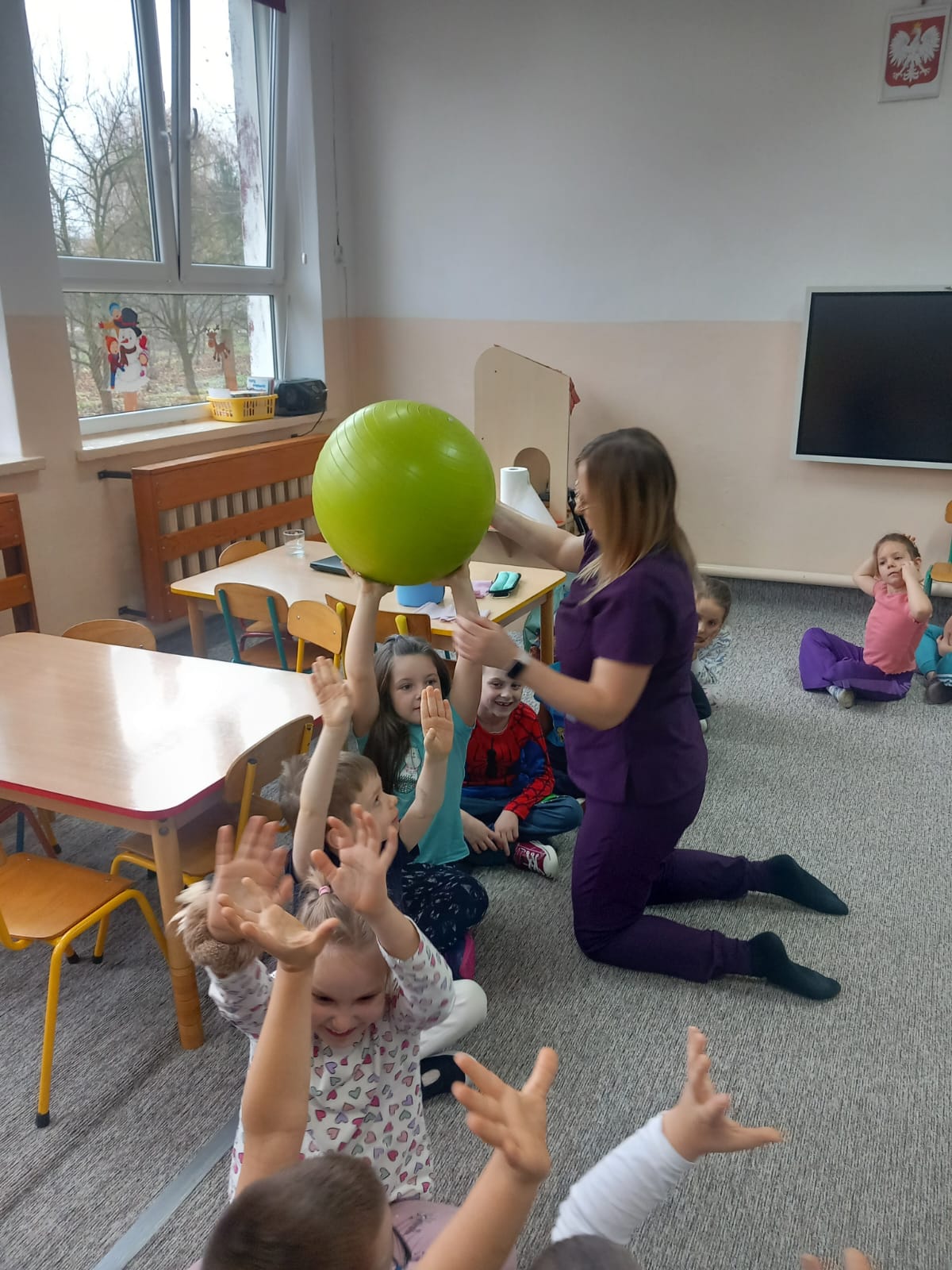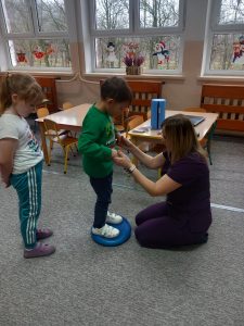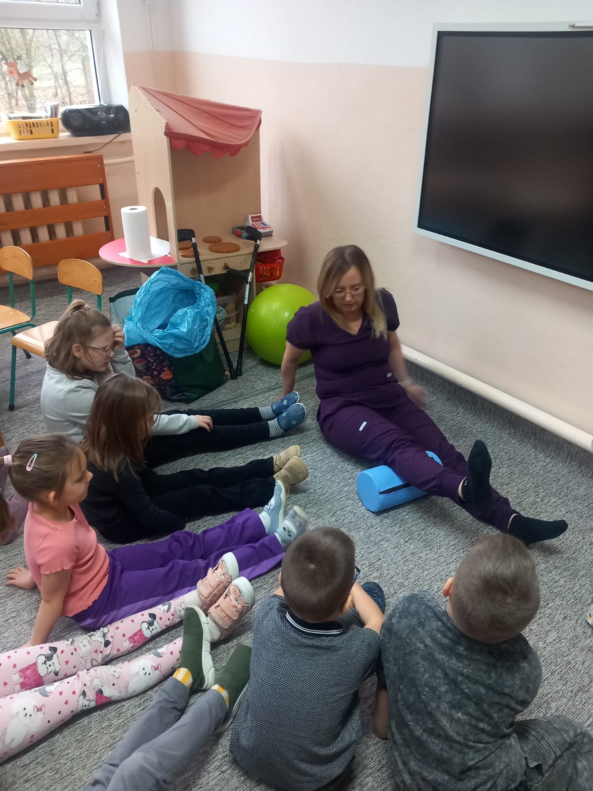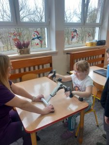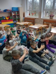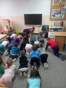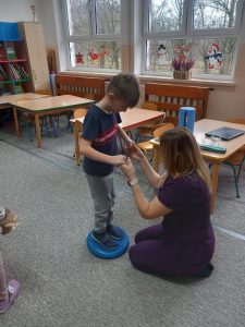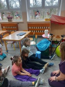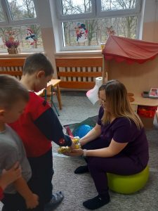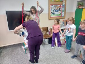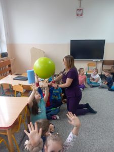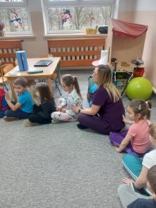 W dniu 2 grudnia w naszym przedszkolu odbyło się spotkanie z panią Małgorzatą Madej-Burek, która jest fizjoterapeutką. Celem spotkania było przybliżenie dzieciom tego zawodu. Nasz gość opowiedział przedszkolakom, na czym polega jego praca oraz komu pomaga na co dzień. Dzieci dowiedziały się, że fizjoterapeuta pomaga osobom po urazach, operacjach oraz tym, które mają trudności z poruszaniem się. W przystępny sposób pani Małgosia wyjaśniła również, jak ważne są ćwiczenia fizyczne, ruch i prawidłowa postawa ciała dla zdrowia. Podczas spotkania pani fizjoterapeutka zaprezentowała proste ćwiczenia ruchowe oraz pokazała niektóre przyrządy wykorzystywane w swojej pracy. Przedszkolaki chętnie uczestniczyły w ćwiczeniach i z zainteresowaniem zadawały pytania. Spotkanie przebiegło w bardzo miłej atmosferze i było dla dzieci ciekawą lekcji. Dzięki wizycie przedszkolaki wzbogaciły swoją wiedzę i dowiedziały się, jak ważna jest aktywność fizyczna w codziennym życiu. Bardzo serdecznie dziękujemy pani Małgosi za ciekawą prelekcję oraz prezenty dla dzieci w postaci piłeczek.