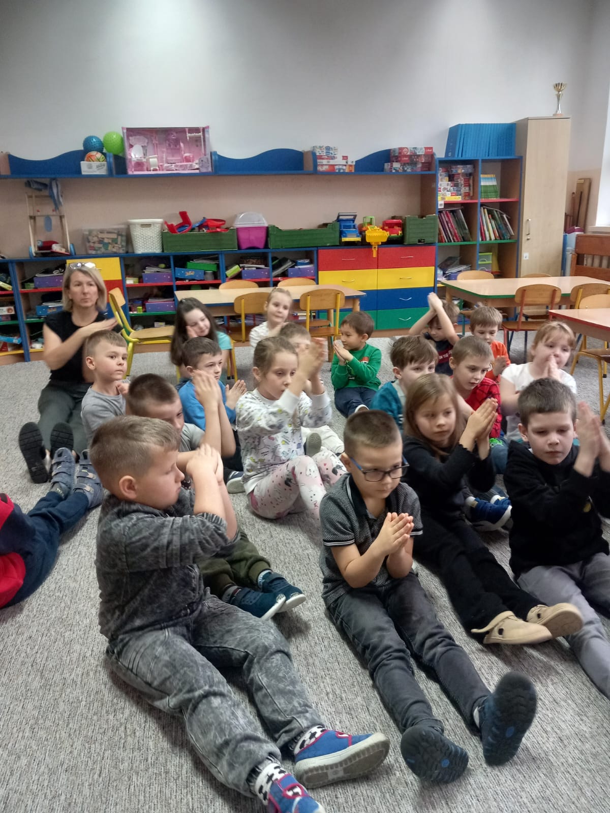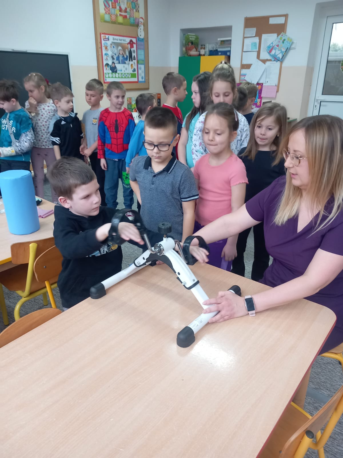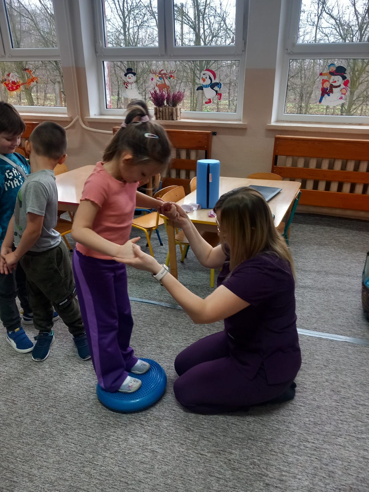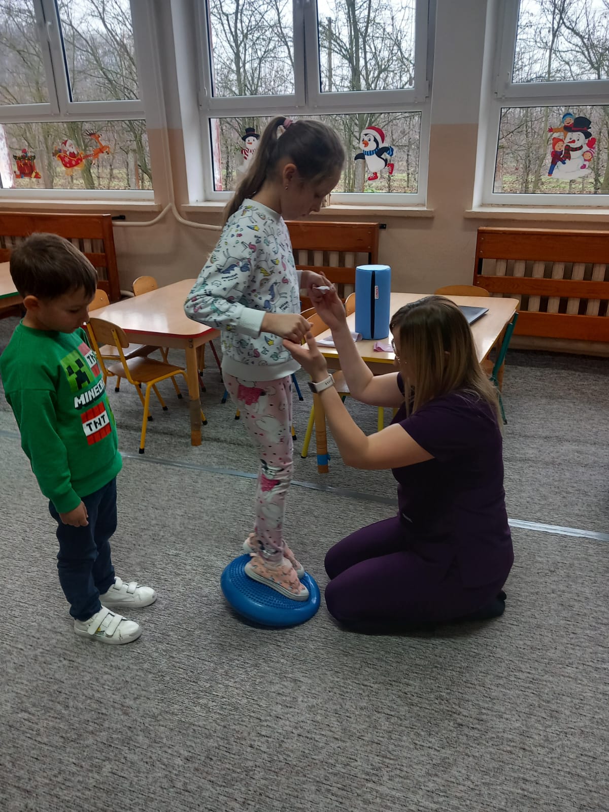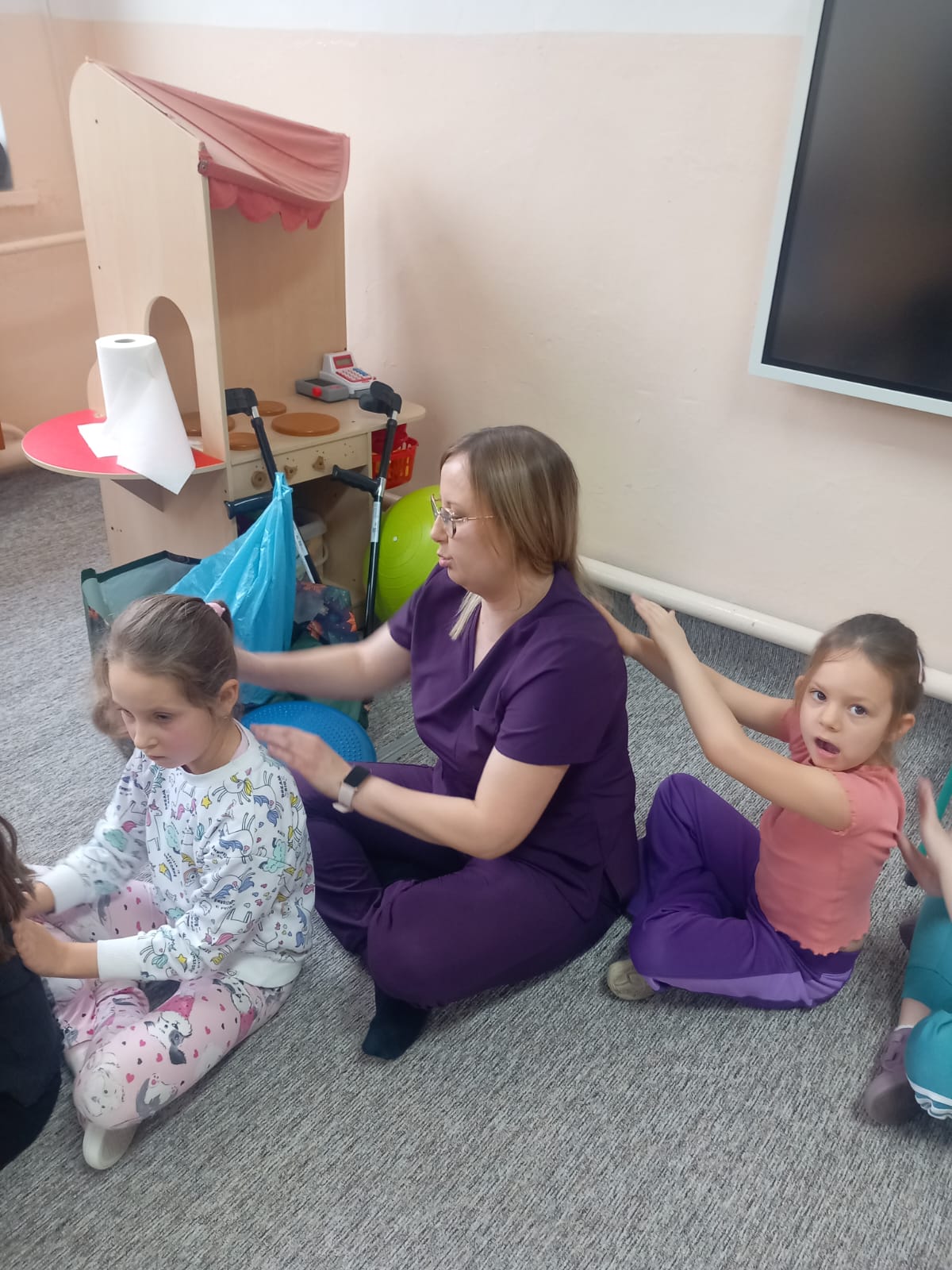 W dniu 2 grudnia w naszym przedszkolu odbyło się spotkanie z panią Małgorzatą Madej-Burek, która jest fizjoterapeutką. Celem spotkania było przybliżenie dzieciom tego zawodu. Nasz gość opowiedział przedszkolakom, na czym polega jego praca oraz komu pomaga na co dzień. Dzieci dowiedziały się, że fizjoterapeuta pomaga osobom po urazach, operacjach oraz tym, które mają trudności z poruszaniem się. W przystępny sposób pani Małgosia wyjaśniła również, jak ważne są ćwiczenia fizyczne, ruch i prawidłowa postawa ciała dla zdrowia. Podczas spotkania pani fizjoterapeutka zaprezentowała proste ćwiczenia ruchowe oraz pokazała niektóre przyrządy wykorzystywane w swojej pracy. Przedszkolaki chętnie uczestniczyły w ćwiczeniach i z zainteresowaniem zadawały pytania. Spotkanie przebiegło w bardzo miłej atmosferze i było dla dzieci ciekawą lekcji. Dzięki wizycie przedszkolaki wzbogaciły swoją wiedzę i dowiedziały się, jak ważna jest aktywność fizyczna w codziennym życiu. Bardzo serdecznie dziękujemy pani Małgosi za ciekawą prelekcję oraz prezenty dla dzieci w postaci piłeczek.