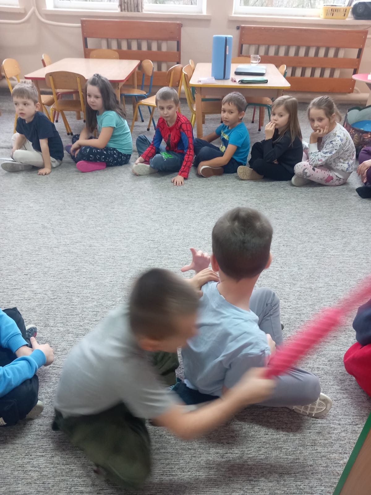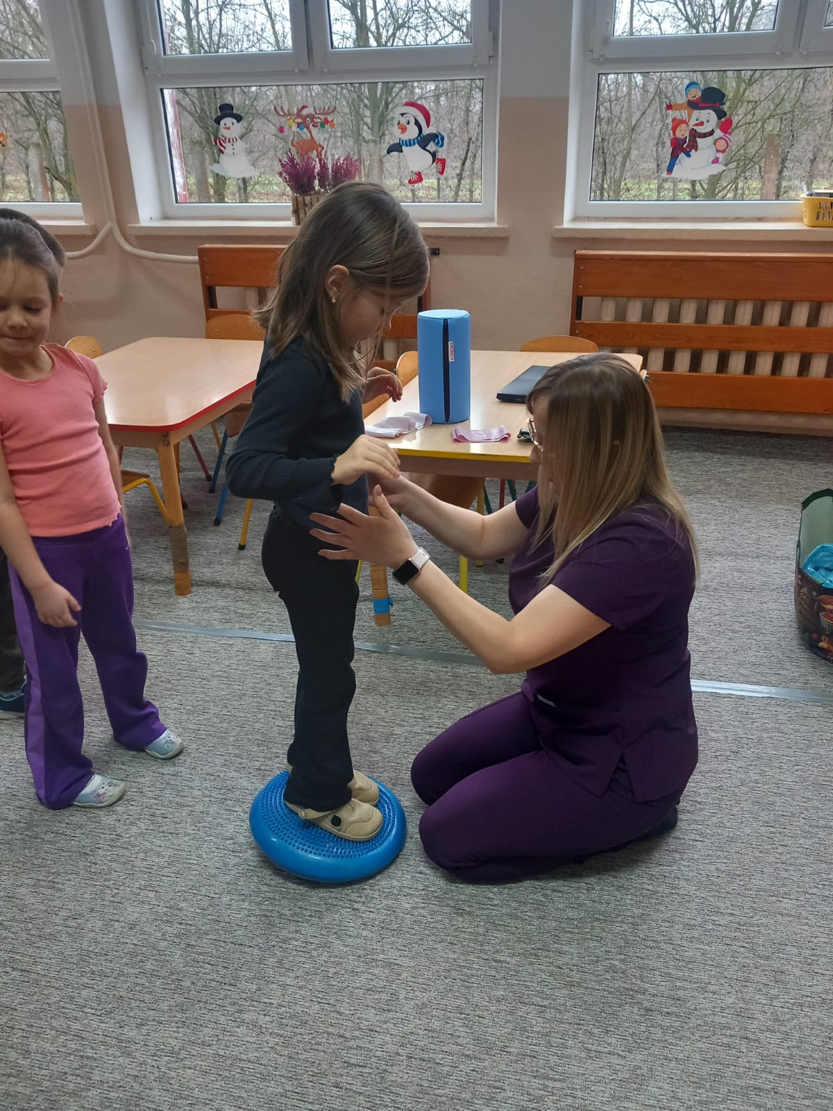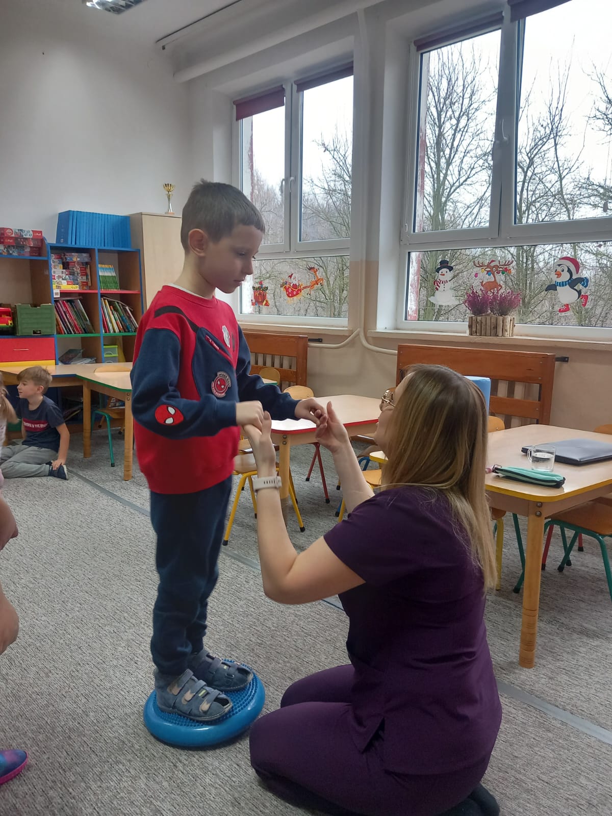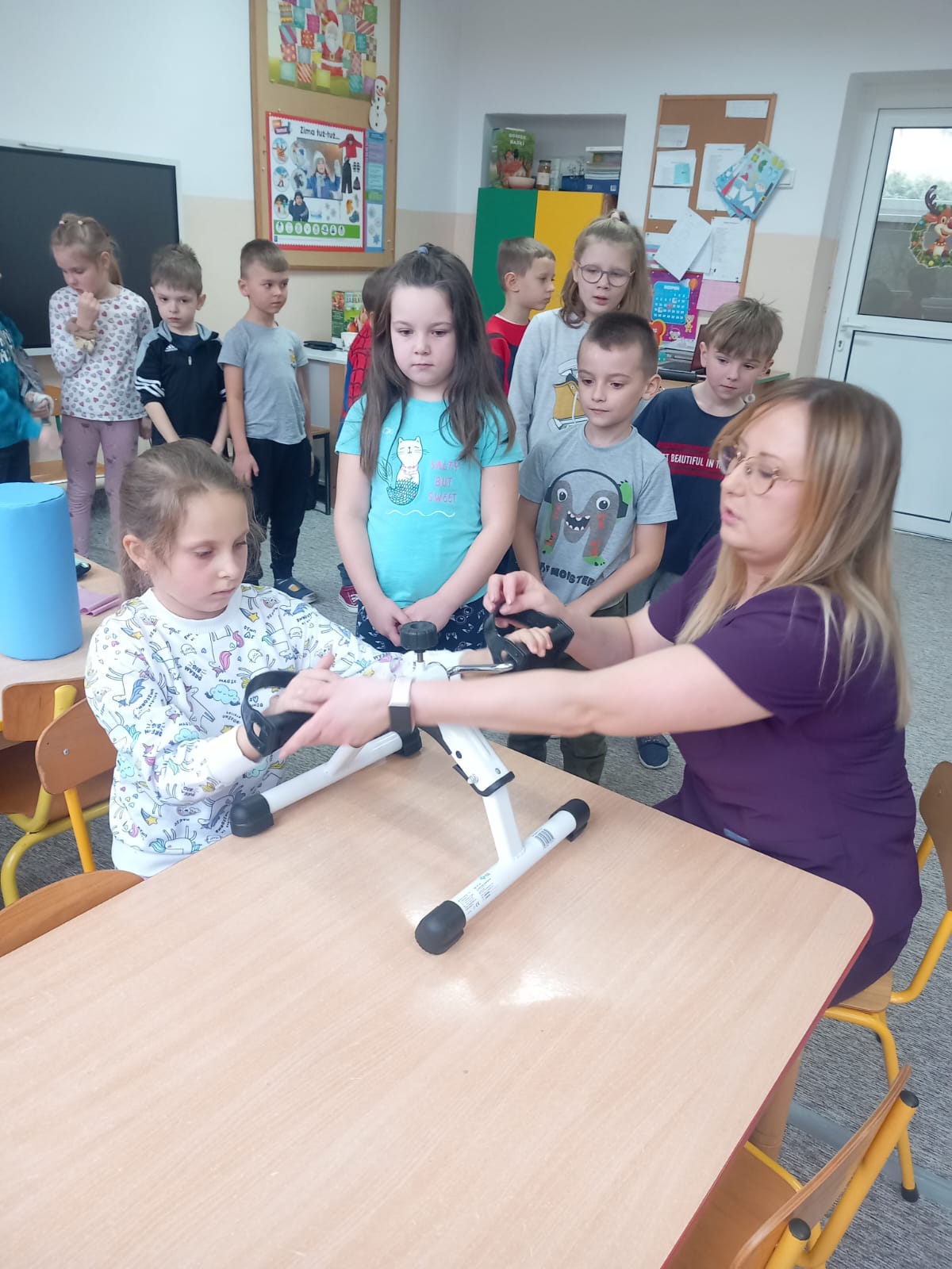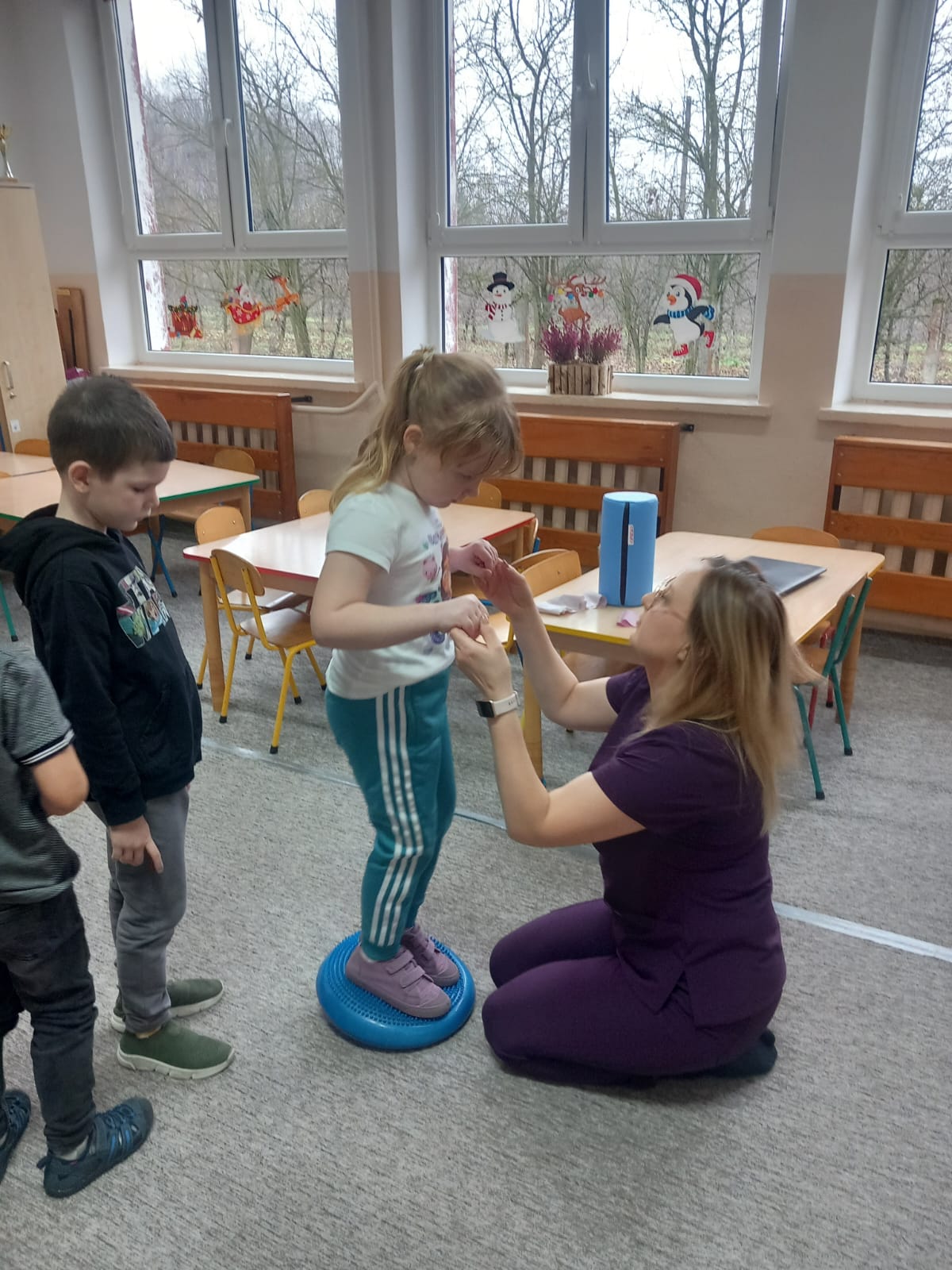 W dniu 2 grudnia w naszym przedszkolu odbyło się spotkanie z panią Małgorzatą Madej-Burek, która jest fizjoterapeutką. Celem spotkania było przybliżenie dzieciom tego zawodu. Nasz gość opowiedział przedszkolakom, na czym polega jego praca oraz komu pomaga na co dzień. Dzieci dowiedziały się, że fizjoterapeuta pomaga osobom po urazach, operacjach oraz tym, które mają trudności z poruszaniem się. W przystępny sposób pani Małgosia wyjaśniła również, jak ważne są ćwiczenia fizyczne, ruch i prawidłowa postawa ciała dla zdrowia. Podczas spotkania pani fizjoterapeutka zaprezentowała proste ćwiczenia ruchowe oraz pokazała niektóre przyrządy wykorzystywane w swojej pracy. Przedszkolaki chętnie uczestniczyły w ćwiczeniach i z zainteresowaniem zadawały pytania. Spotkanie przebiegło w bardzo miłej atmosferze i było dla dzieci ciekawą lekcji. Dzięki wizycie przedszkolaki wzbogaciły swoją wiedzę i dowiedziały się, jak ważna jest aktywność fizyczna w codziennym życiu. Bardzo serdecznie dziękujemy pani Małgosi za ciekawą prelekcję oraz prezenty dla dzieci w postaci piłeczek.